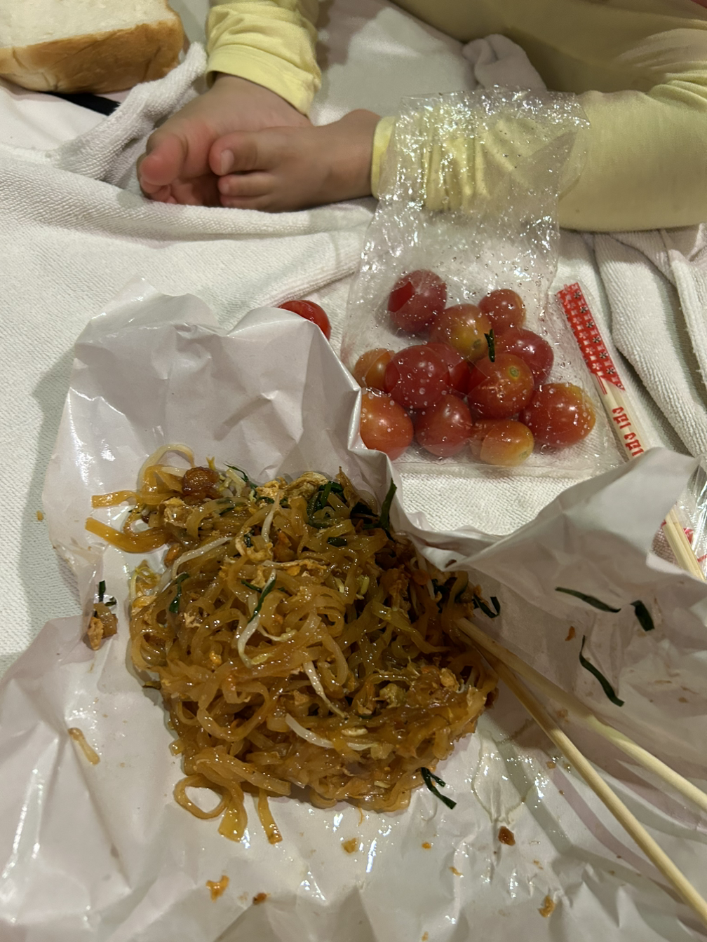 여긴 주택가라 근처에 슈퍼도, 가게도 찾기 어려웠다. 3일째 되는 날 배고픈 나는 식당을 찾아 헤맸다. 20분을 걸어 작은 노점을 겨우 찾았다. 팟타이 2인분을 주문했다. 근처 슈퍼에서 방울토마토, 식빵 등을 함께 구매했다. 숙소로 돌아와 아이들과 맛있게 먹었다. 그리고 나는 그날 밤 잠을 이루지 못했다.