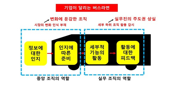 이러는 사이 회사는 큰 방향과 준비를 잃게 됩니다. 변질된 기획 부서는 모든 큰 방향과 준비를 자기들이 생각하기 귀찮으니 사업을 가장 잘 아는 하위 부서에서 하라고 말하지만 그들은 힘이 없는 경우가 많습니다. 생산량에 대한 재량, 인재 선발 및 보충과 배치에 대한 권한, 비용집행 및 투자에 대한 결정권을 보통 중앙에서 쥐고 있는 경우가 많기 때문이죠. 이 중 어느 것 하나라도 하부 조직에서 갖고 있지 않으면 설령 뭔가 사업의 단서를 찾았다고 해도 그것은 실제 준비와 매우 괴리되어 있습니다. 기획부서는 자신들이 원래 해야 할 시장의 중장기적인 흐름과 방향, 우리가해야 할 포지셔닝에 대해 둔감하죠. 그 사이 모든 방향과 역량을 준비한 경쟁자들은 이 비대하고 둔한조직을 앞서 나갑니다. 기획실은 왜 뒤쳐지냐고 실무진을 압박하고 괴롭히기만 하겠죠.