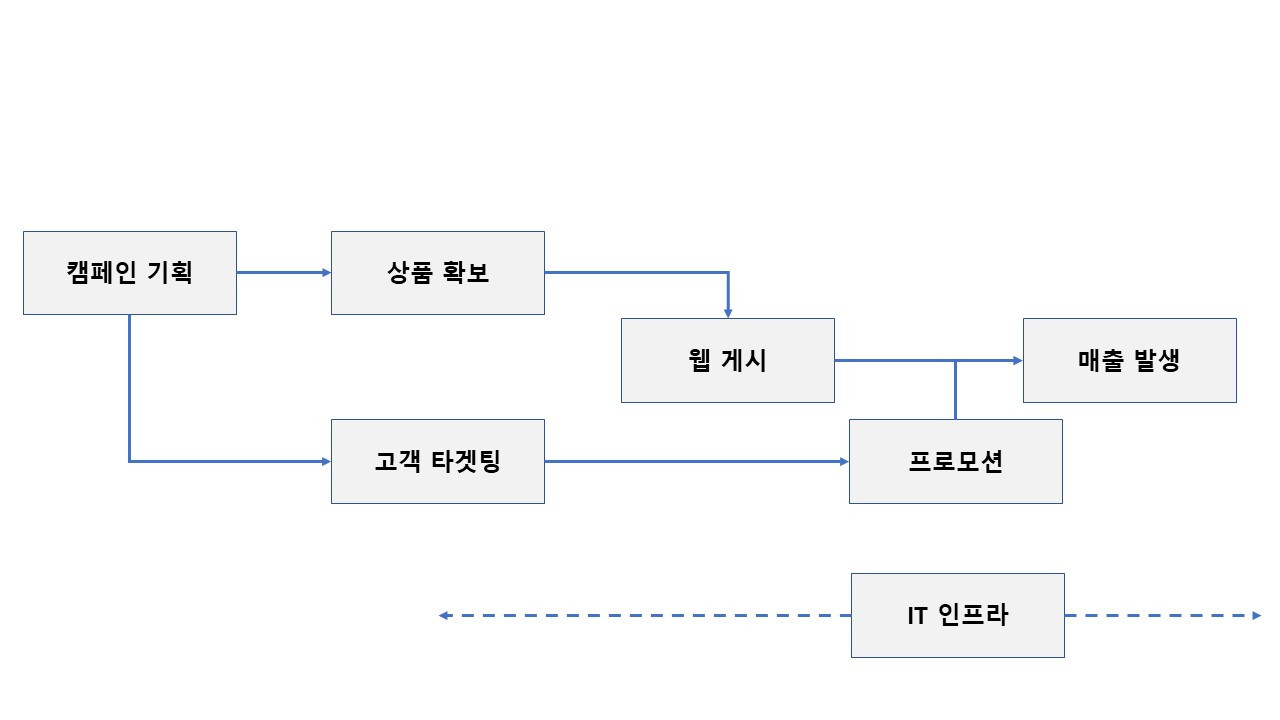 예를 들어봅시다. 한 온라인 커머스 기업이 있다고 해보죠. 주변에 많이 볼 수 있는 물건을 소싱해서 웹이나 모바일에 올리고 사람들이 구매하는 그런 유통업체 말이죠. 매우 단순하게 하나의 캠페인이 기획부터 매출로 이어지기까지 순서를 아래에 나타내 보았습니다.