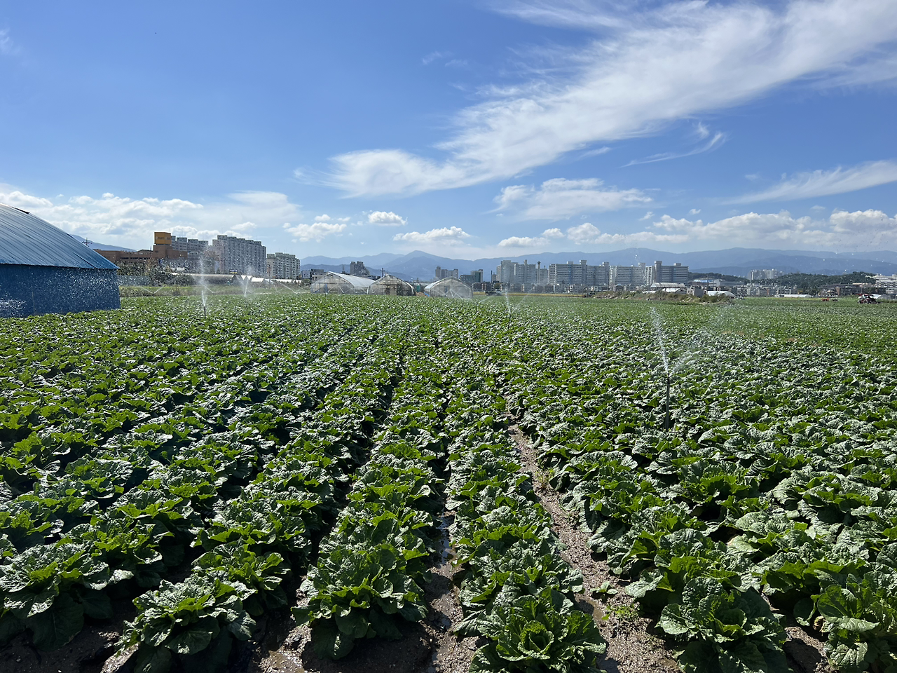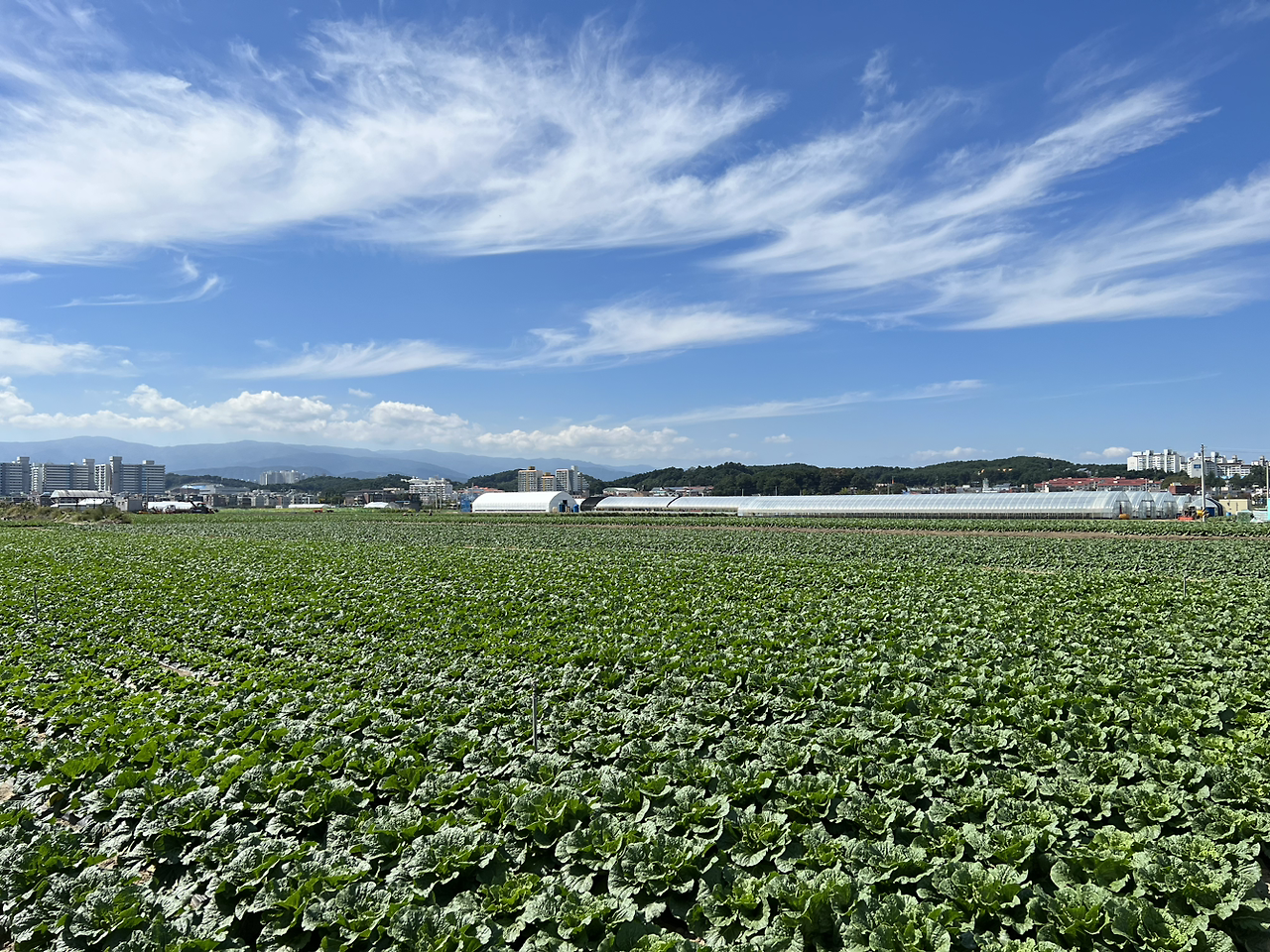 강릉 송정동에 도착하였다. 가는 길에 초당에서 짬뽕순두부가 형편없었다는 것은 덤이다. 하지만 기대와 달리 고랭지가 아닌 평지였다. 오히려 차도도 가깝고 주민센터도 있고.. 이건 그냥 평범한 시골 같은데? 주민센터 가서 무와 배추농장이 어딘지 물어봐야 하나? 싶던 찰나 엄청난 규모의 배추밭이 눈에 들어왔다. 관광지로 유명한 초당에서 그리 멀지 않은 곳에 이런 대규모 밭이 있다니 스프링클러가 만드는 무지개 속에 자리한 배추밭들은 절경이었다. 가까이서 보고자 차에서 내려 무작정 걸었다.