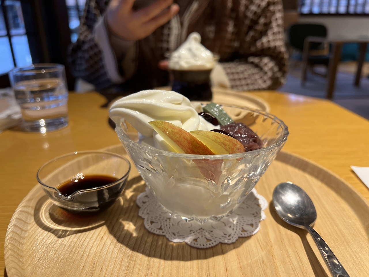 오후 4시. 점심시간이 한참 지나서 방문했는지 손님은 두 테이블뿐이었다. 무척 친절하신 할머니께서 우리를 반겨주셨다. 메뉴판에 한글은 없지만, 사진이 있기에 무난히 주문할 수 있었다. 정식, 디저트, 카레, 라멘, 술, 교토답게 각종 절임류까지 다양한 메뉴가 있었지만 우리의 주문은 정식. 사진을 가리키며 このメニューを2つお願いします(이 메뉴 두 개 부탁드립니다.). 그리고 크림커피로 보이는 디저트와 안미츠(삶은 팥과 각종 과일 및 깍둑썰기를 한 우뭇가사리 묵, 떡, 꿀, 아이스크림 등을 얹은 일본 음식)를 주문했다.