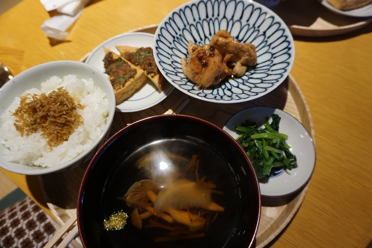 우리가 주문한 정식이 나왔다. 메인으로 보이는 닭 허벅지 살을 이용한 조림, 튀긴 양념두부, 겨울시금치절임, 유자풍미의 맑은 버섯국, 작은 멸치가 올라간 백미밥. 심플한 구성. 일본은 밥 짓기에 진심이구나 싶다. 쌀 씻기에 심혈을 기울인 듯, 군내 하나 없는 밥으로 온전히 쌀 맛에 집중할 수 있었다.