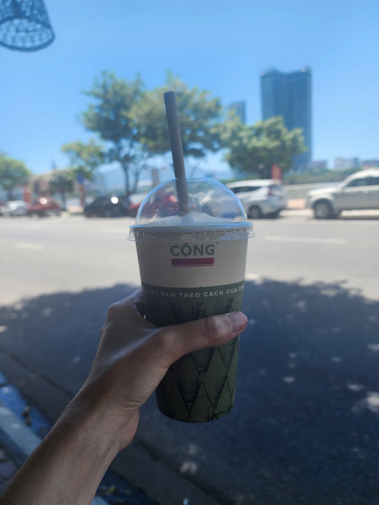 직원에게 메뉴 추천을 부탁했더니 코코넛 커피 스무디를 추천합니다. 베트남에서는 영어가 그다지 잘 통하지 않는 편이지만 파파고를 적극 이용하면 의사소통에는 전혀 문제가 없습니다. 카페는 이미 만석이었고 제 앞으로 대기줄이 꽤 길었지만 코코넛 커피 스무디는 맛이 좋았습니다. 베트남 여행 전 물갈이에 대한 얘길 많이 들어서 배탈이 날까 걱정했는데 저는 밖에서 파는 걸 먹어도 큰 문제가 없었습니다. 어렸을 적 인도의 비위생적인 성장환경이 만들어준 면역력인가 봅니다. 제 경우에 한해 괜찮았던 것이니 민감한 사람들은 알아서 조심하는 게 좋겠습니다. 낭만과 무모함은 정말 한 끗 차이입니다.