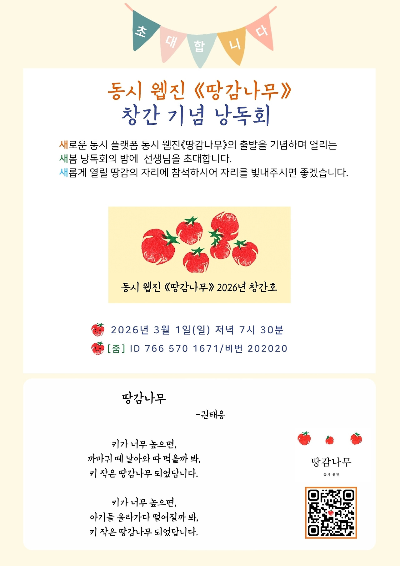 동시를 맘껏 읽을 수 있는 웹진이 생겨서 반갑다. 누구나 들어와서 마음껏 읽고 즐기면 된다. 《땅감나무》 창간호에 실린 53편의 동시들 중 나의 시선을 붙잡은 건 권영상 시인의 〈보통〉이다. 얼굴도 보통, 공부도 보통, 운동도 보통인 '나'를 통해 나를 들여본다. 앞서 가는 사람과 뒤처지는 사람의 기준이 되는 평범한 나. 그런 내가 그 둘을 향해 박수를 쳐줄 수도, 손을 내밀어줄 수도 있는 위치라고 생각하니 기분이 좋다. 결국 이 세상은 보통의 사람들로 인해 잘 굴러가는 것 아닐까 싶다. 그러니까 보통의 사람인 나는, 평범한 내가 참 좋다.