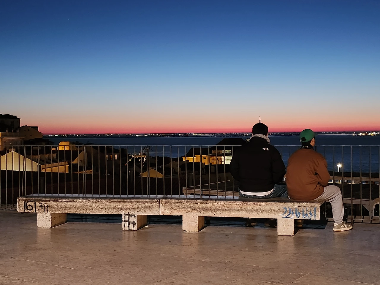 다행히 산타루치아 전망대에 금세 도착했다. 해가 뜨기 한참 전. 전망대 입구에 보이는 따뜻한 차와 빵을 파는 푸드트럭이 보였다. 제대로 왔구나. 반가운 형광등 불빛이여. 우리보다 이른 시간에 도착한 두서너 명 정도의 사람들도 거기서 차를 마시며 몸을 녹이는 듯 보였다. 고개를 돌려보니 오른쪽으로 어스름한 새벽의 테주강과 콕콕 박힌 집들이 환상적인 분위기를 만들어내고 있었다.