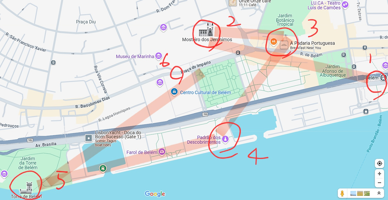 이곳은 제로니무스 수도원과 파스 텔 드 나타 본점이 있는 곳인데 타구스강 쪽에 발견기념비, 벨렝탑과 같은 관광지를 묶어 볼 수 있는 장소이기도 하다.