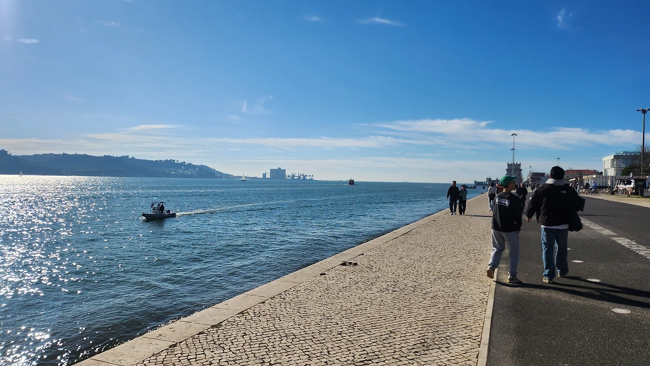 하지만 기념비보다 우리의 시선을 붙잡는 건 윤슬로 반짝이는 타구스강. 오래 걸은 피로도 풀 겸 강가에 앉아 4월 25일 다리와 구세주 그리스도상을 보면서 시간을 보냈다. 떠다니는 요트와 페리를 보면서 건너편 알파마 지구를 가볼까 살짝 고민될 정도로 아름다운 풍경이다. 기념비에서 오른쪽으로 쭉 강을 끼고 걸어가면 벨렝탑을 볼 수 있기에 조금 더 걷기로 했다.