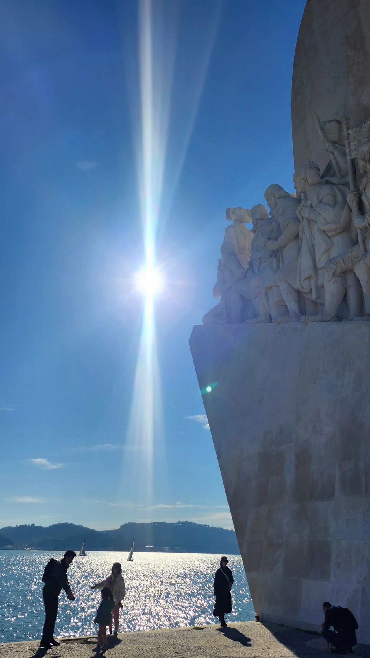수도원 구경을 마치고 나온 우리는 나따 본점에 들른 다시 공원을 통과해 타 구스강 쪽으로 걸어갔다. 디스크가 좋지 않은 남편은 오래 걸으면 다리에 통증이 오는지라 장시간 걷게 되면 괜히 미안한 마음이 든다. 그래도 선선한 바람이 불고 날씨가 좋아서 기분 좋게 발견기념비까지 웃으며 걸어갔다. 포르투갈의 대항해 시절 바다를 누볐던 해양왕 엔리케의 사후 500년을 기념하기 위해 세워진 비인데, 이 기념비가 세워진 위치가 바스코 다 가마가 항해를 떠난 자리라고 한다. 조각상으로 새겨진 사람들은 대항해 시절에 활약했던 인물들이라고 하니, 설명과 조각을 매칭하면서 보는 재미도 있다. (맨 앞에 서있는 인물이 엔리케, 그 뒤가 바스코 다 가마 이다)