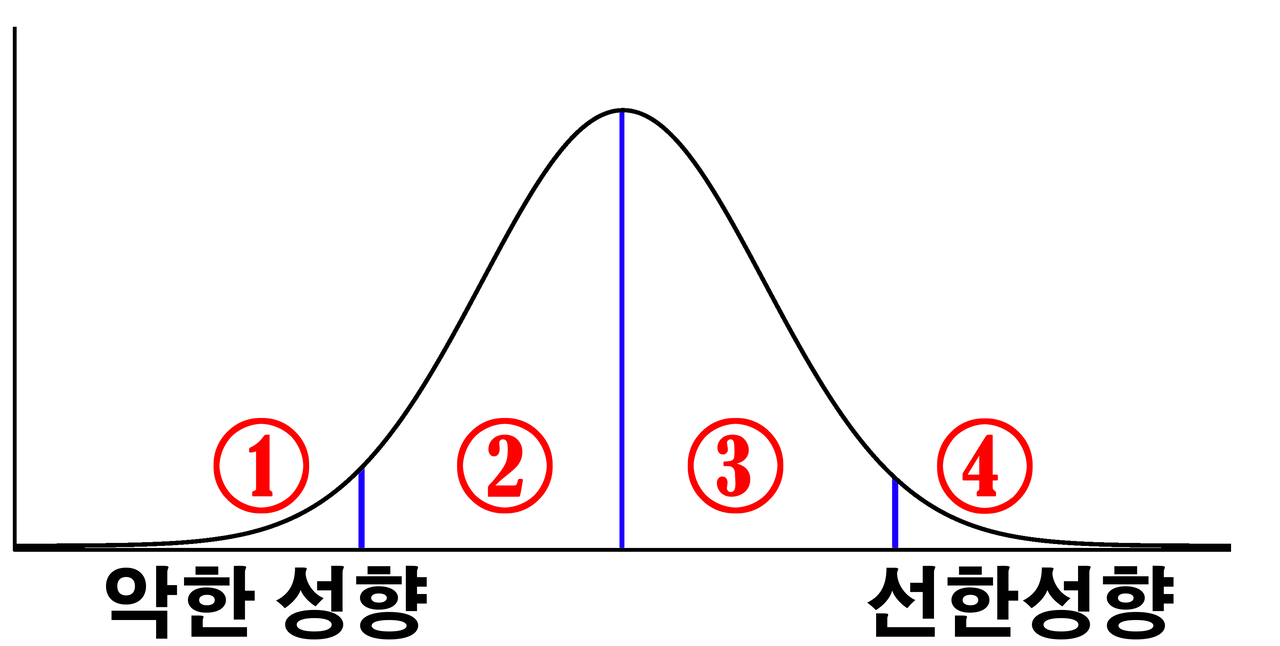 사실 사람이 얼마나 선한지 악한지를 정확이 알 방법은 없다. 잔칫집에 인심 난다는 말이 있듯이 우리 인간은 풍족하다고 느끼면 선해지고 부족하다고 느끼면 악해지는 본성을 가지고 있다. 어쩔 수 없다. 살고 싶다면 그렇게 상황에 따라 적응해야 한다. 그러니 일단 인간이 가진 선과 악의 본성도 위의 그림처럼 자연의 법칙인 표준분포 곡선을 따른다고 가정해 보자.