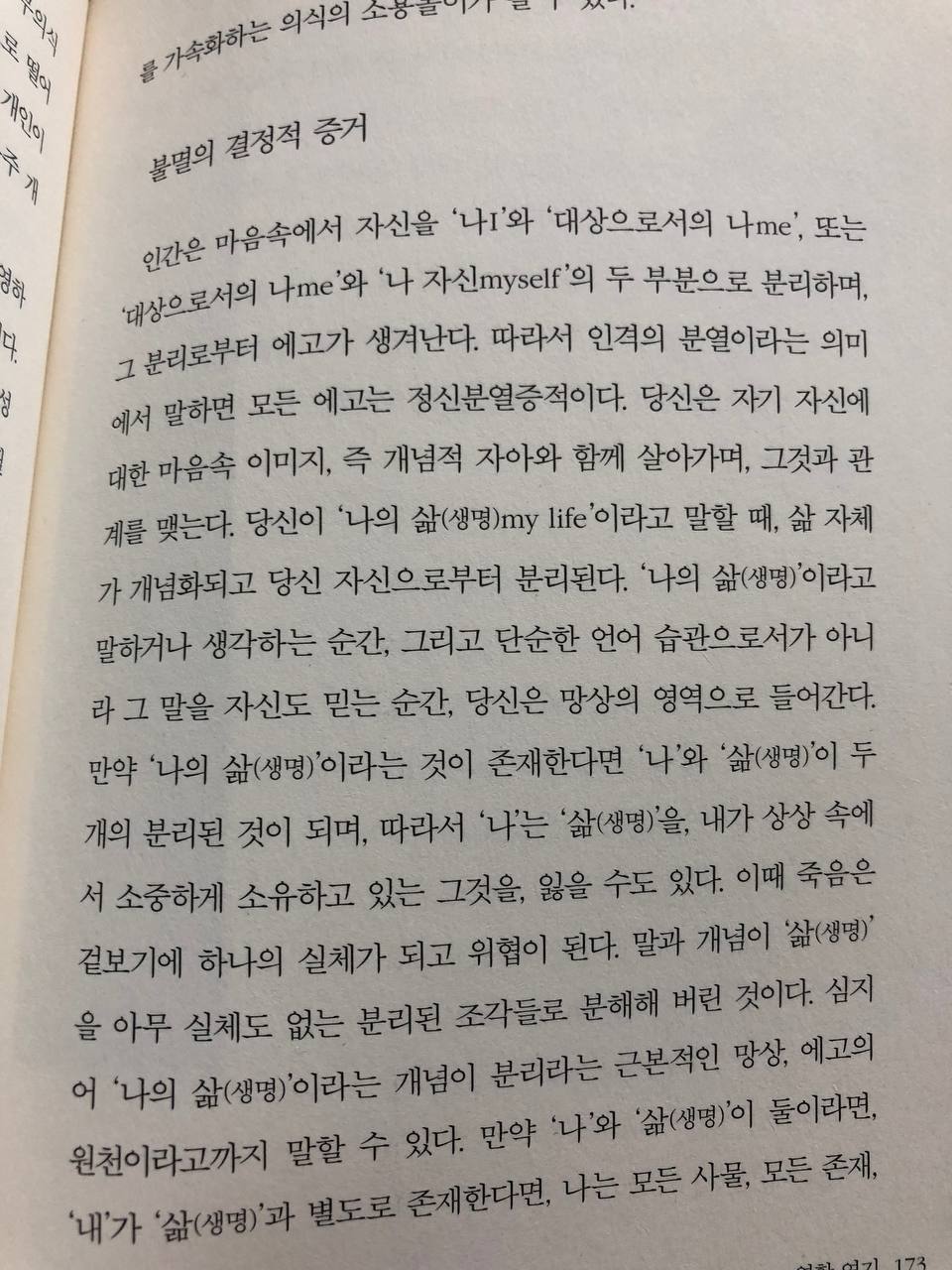 우리는 삶이라는 소유할 수 없는 것을 소유하고 있다고 믿다가, 그것을 잃는 순간을 따로 죽음이라 부르고 있다. 톨레 씨는 이것을 정신분열증이라고 설명해줬다. 듣고 보니 제대로 받아들이긴 힘들어도 충분히 이해는 갔다. 도대체 우리는 왜 그런 이상한 짓을 하고 있을까?
