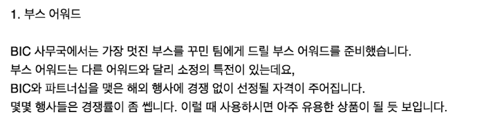 그렇게 '본진'에 합류할 준비를 착실히 해가던 어느 날 운영 사무국으로부터 부스 어워드를 수상하면 해외 게임쇼에 나갈 수 있는 특전이 주어진다는 소식을 듣게 되었다. 그리하여 해외 게임쇼에 참여할 수 있다면 게임을 알릴 수 있는 기회가 조금이라도 더 생길 수 있겠다는 생각이 들어 부스 어워드를 우리의 것으로 만들어보자는 목표를 세우게 되었다.