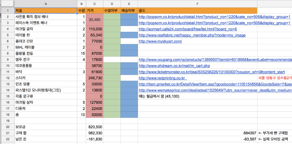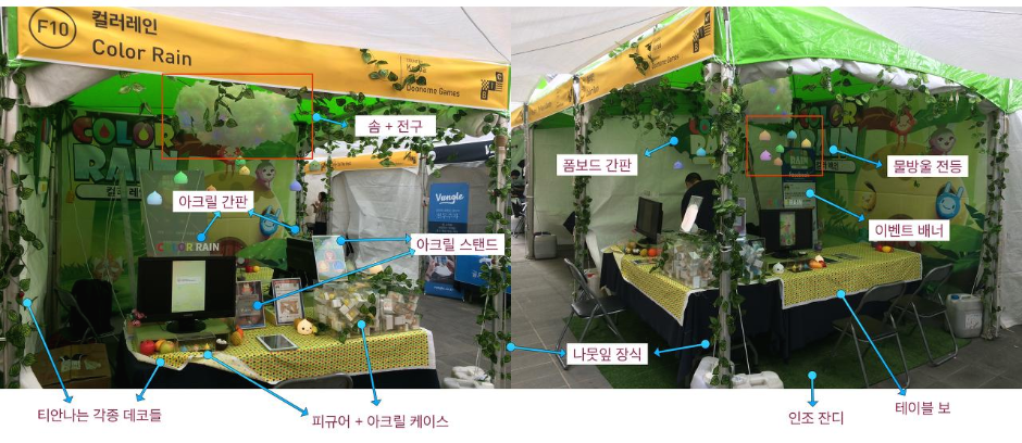 부스의 전체적인 느낌은 게임 내 배경인 마니섬을 상징하는 자연을 표현하면서 게임의 핵심 주제인 색색의 비가 내리는 하늘을 표현하고 싶었다. 그리고 이러한 목표를 실제로 달성해줄 수많은 물품들을 정리하고 구매하기 시작했다.