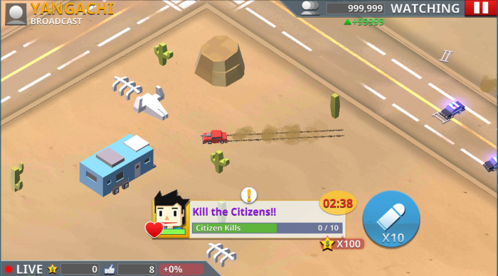그것이 지금 서비스 중인 버전의 컨셉인 ‘운전을 소재로 인터넷 방송을 한다’였다. 세상의 관심이 너무 받고 싶었던 주인공이 ‘미친 운전’을 통해 시청자의 반응인 좋아요와 별풍선을 받게 해주면 재밌을 것 같았다. 정신 나간 운전을 하는 목적성도 명확하다고 생각했다. 제작상의 목표는 간단했다. 인터넷 방송을 하는듯한 화면에 시청자가 보고 있는 느낌, 그리고 시청자에게 보상을 받는 느낌을 전해주면 되는 것이었다.