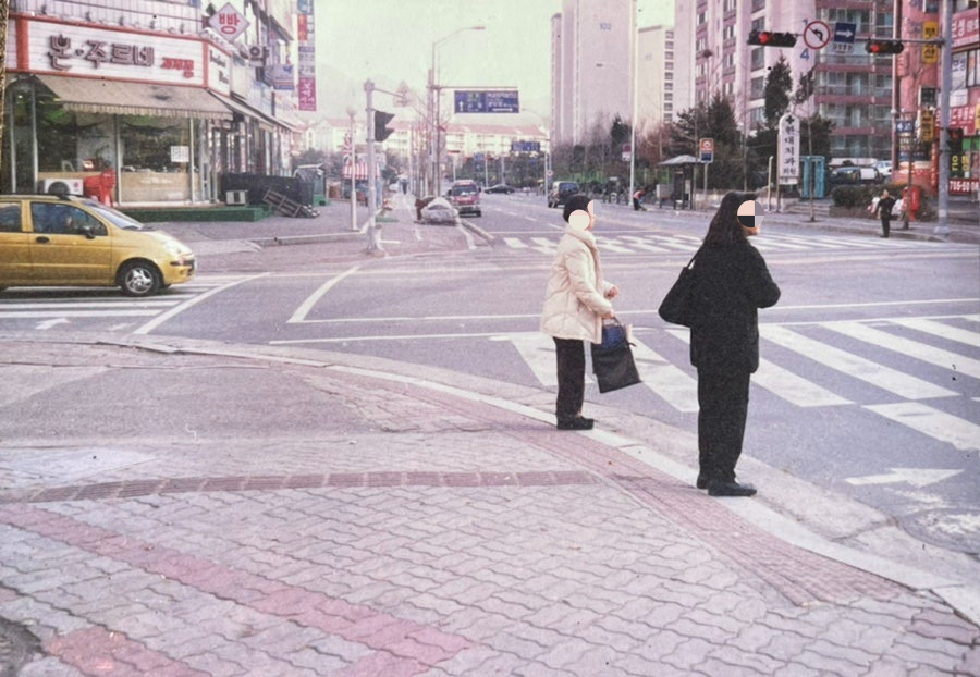그때 찍어 인화한 사진을, 언제 저 사진 두 장을 찍었는지는 정확히 기억나지 않지만, 여자는 지금도 다이어리에 넣고 다니는데, 어떻게 저런 횡단보도가 있을 수 있는지, 지금 보면 놀랍기만 하다.