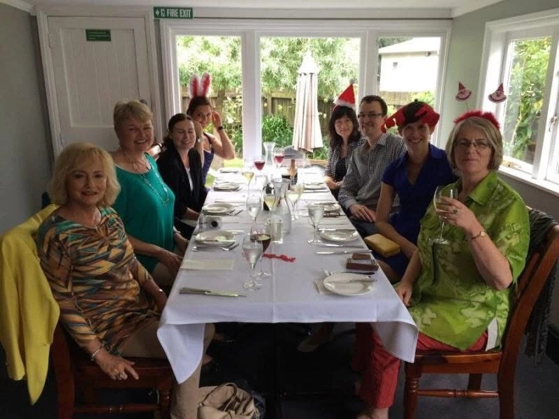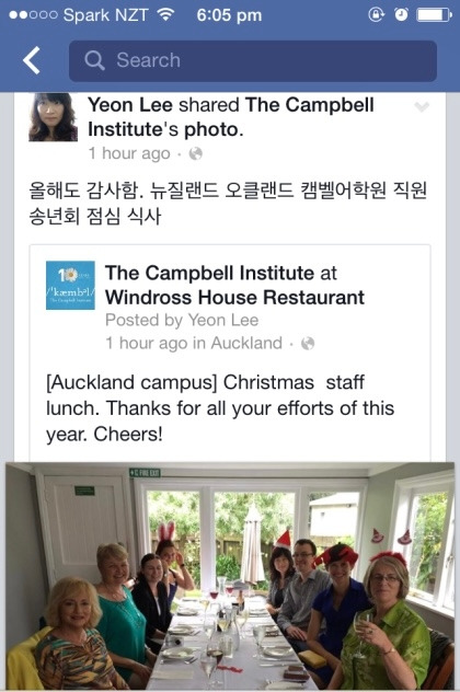 뉴질랜드는 12월 25일 크리스마스가 연중 큰 명절로(한국의 설날, 추석만큼) 보통 이삼주 휴가(여기선 holiday라고 한다, 미국은 vacation)를 갖는데 여기는 12월이 한 여름이라, 그야말로 한여름의 크리스마스를 즐긴다. 그래서 다들 루돌프 머리띠, 산타 모자 등을 장착하고 있다. 따뜻하고 다정한 사람들. 코클베이의 윈드로스 하우스 레스토랑에서 가진 캠벨어학원 크리스마스 스텝 런치.