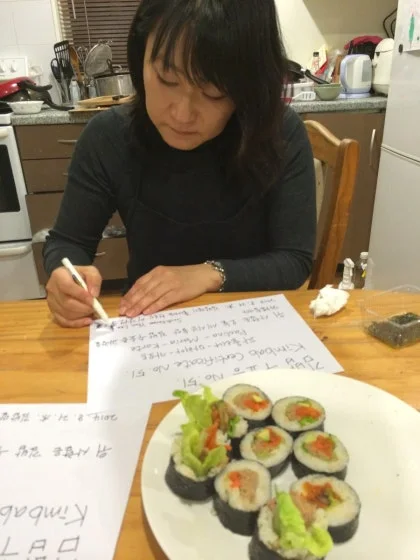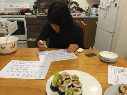 2012년 당시만 해도 다들 한국의 김밥을 스시라고 부르고 있었다. 지금도 물론 스시집이 많고 스시 가게의 90% 이상을 한국인이 운영하고 있지만, 한국 가정식 김밥과 스시는 외양이나 개념도 달라서 여자가 싸는 걸 도저히 스시라고 스스로 부를 수가 없었다. 해서 여자는 어학원 사람들에게 우리는 이걸 한국에서 김밥이라 부르고, 김은 seaweed, 밥은 rice 란 뜻이고 주로 익힌 고기 및 채소를 다양하게 속 재료로 넣는다고 알려줬었다. 그러면 다들 아무도 그런 말을 해 준 적이 없었다며 처음 듣는다고 놀라곤 했었다.