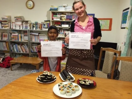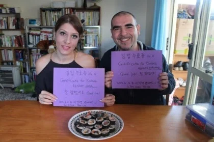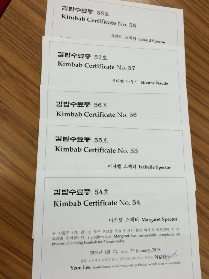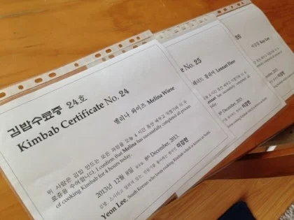 그래서 처음 크리스티나와 티바이티에게는 한글로는 김밥 수료증이라 쓰고 영어로는 코리안 스시 수료증이라고 써주었는데 그다음부터는 김밥 수료증 Certificate of Kinbab, Kimbab Certificate으로 써주었다.