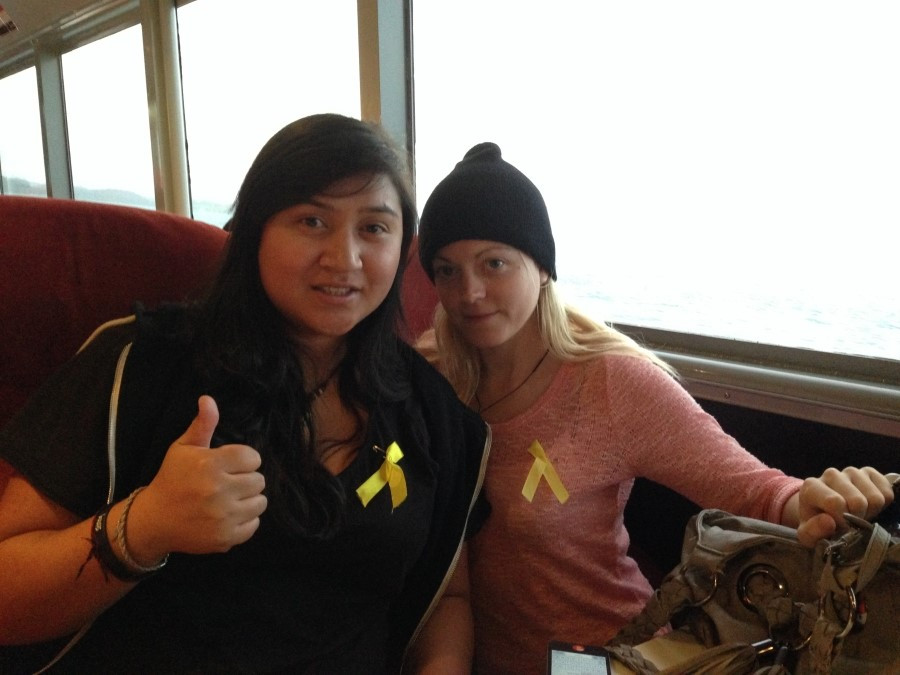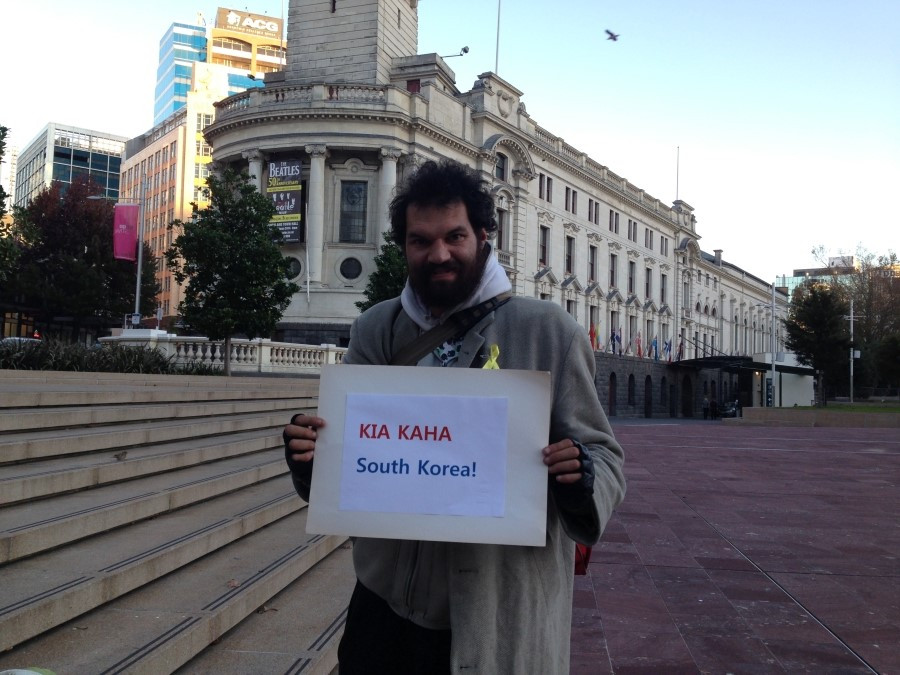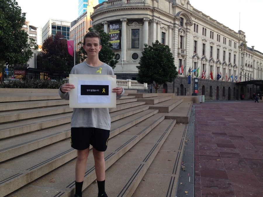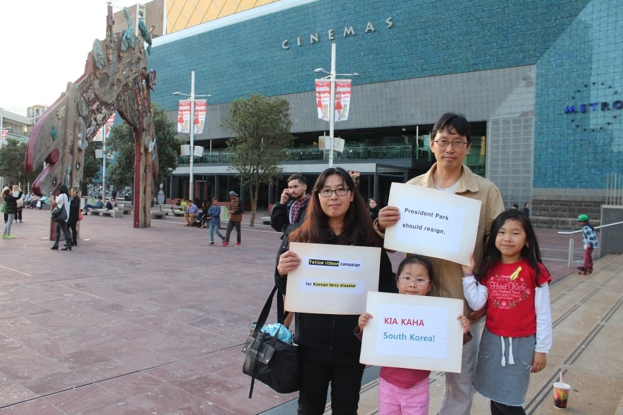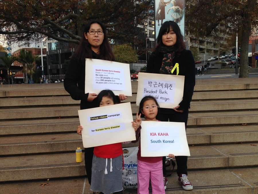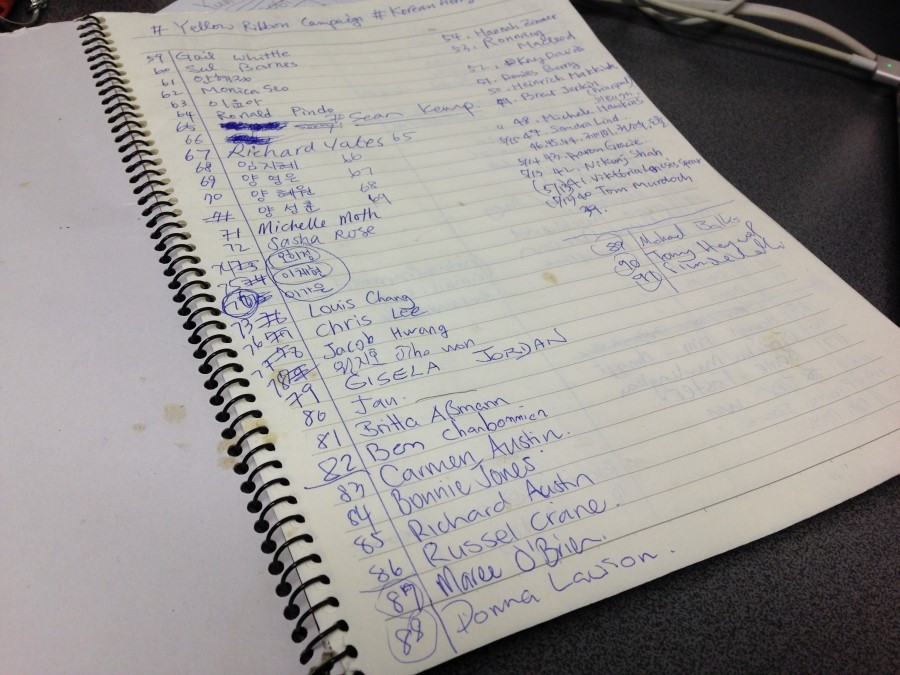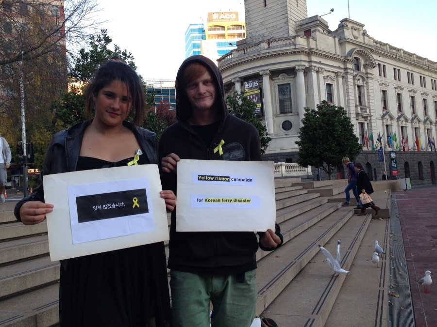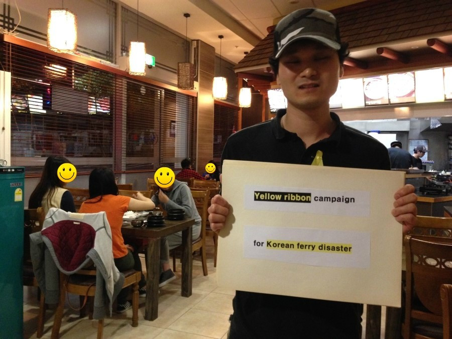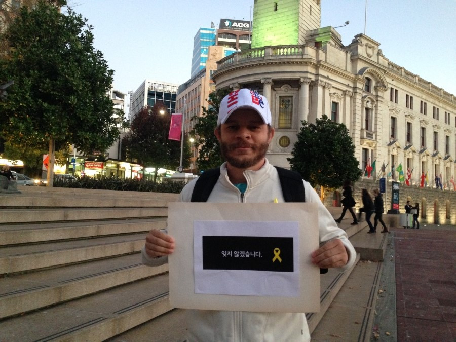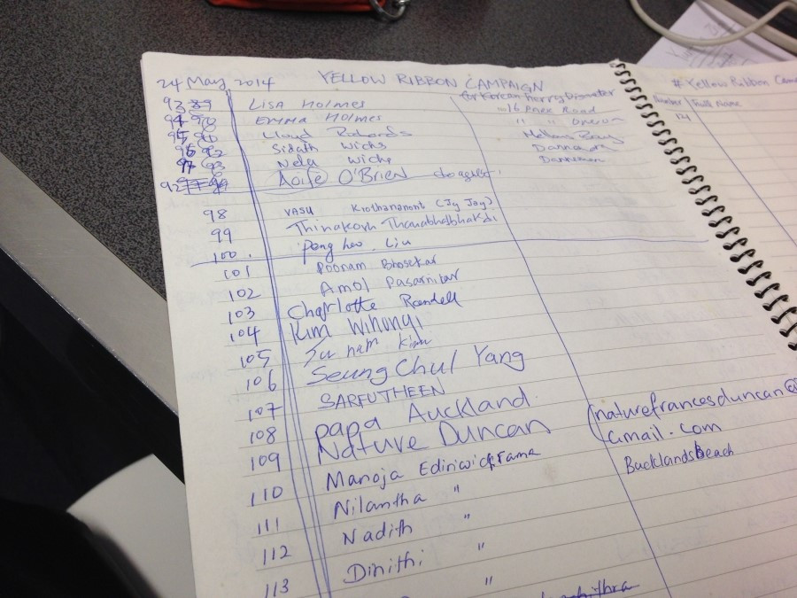 Yellow Ribbon Campaign and Sewol Ferry Protest Movement, 여자는 이 옐로 리본 캠페인을 그때부터 시작했다. 어학원에서부터 시작해 한국의 광화문 광장 격인 오클랜드의 아오테아로아 광장은 물론, 와이헤케 섬으로 가는 페리, 아이들의 학교, 동네 주민들, 히스토리칼 빌리지 직원들 등에게 세월호 참사를 설명하고 리본 달기 운동에 참여해 달라고 부탁했다. 리본 단 사진을 페이스북에 올릴 것을 허락받았고, 공책에 자필 사인도 받았다.