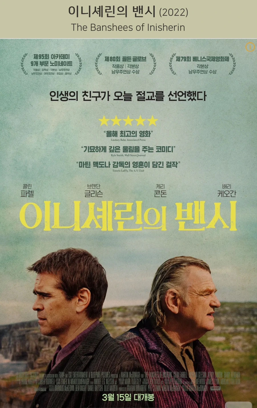 정말 콜린 파렐이 맞는지 몇 번 확인하며 볼 정도로 놀라웠던 그의 지질하고 다정하지만 점점 흑화 되어가는 혼을 다한 연기와 아일랜드 민속 악기들을 실제로 다룬다는 브렌던 글리슨의 미친 연기에 정신을 놓고 봤다.