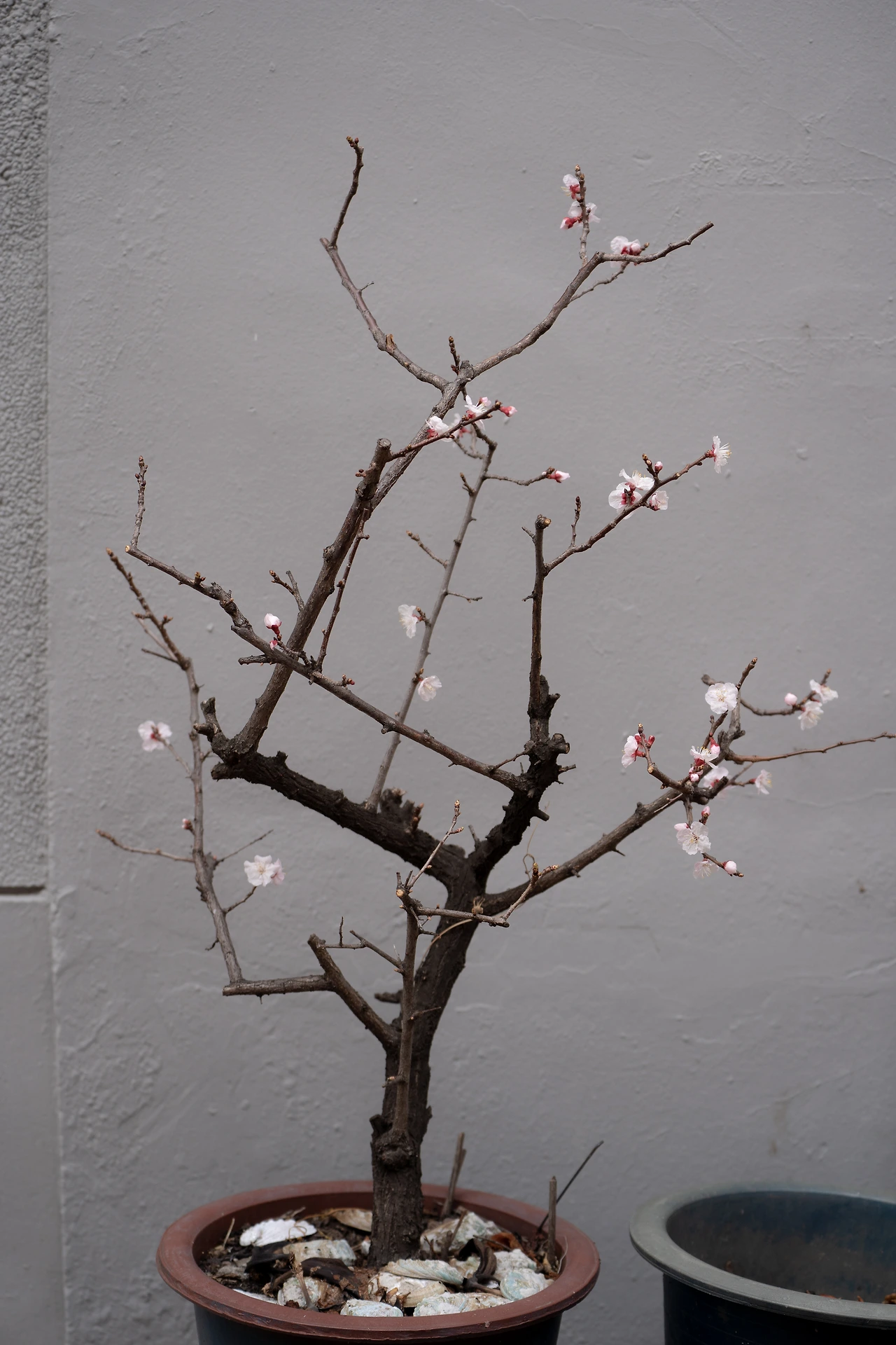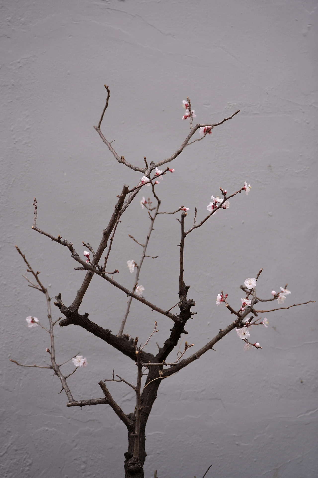 길을 걷다 회색 벽 앞에서 춤추는 매화나무를 만났습니다.
