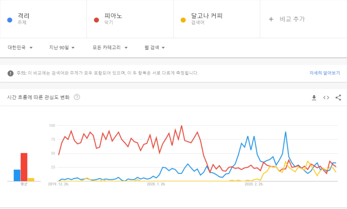 여기서 나는 이런 생각을 해 보았다. 그러면 이제 집에서 피아노를 치려고 하는 사람이 많아지지 않을까? 궁금해서 '격리-피아노-달고나 커피'로 최근 90일 동안 대한민국에서의 구글 트렌드 검색을 해 보았다.