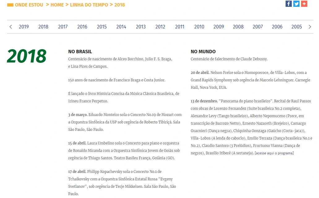 피아노 학회 아니랄까봐, 피아노 관련 타임라인도 가지고 있다. 좌측 단에는 해당 연도 브라질에서 일어난 피아노 관련 사건을, 우측 단에는 세계에서 일어난 일을 담고 있다. 2018년이 클로드 드뷔시 서거 100주년이었구나.