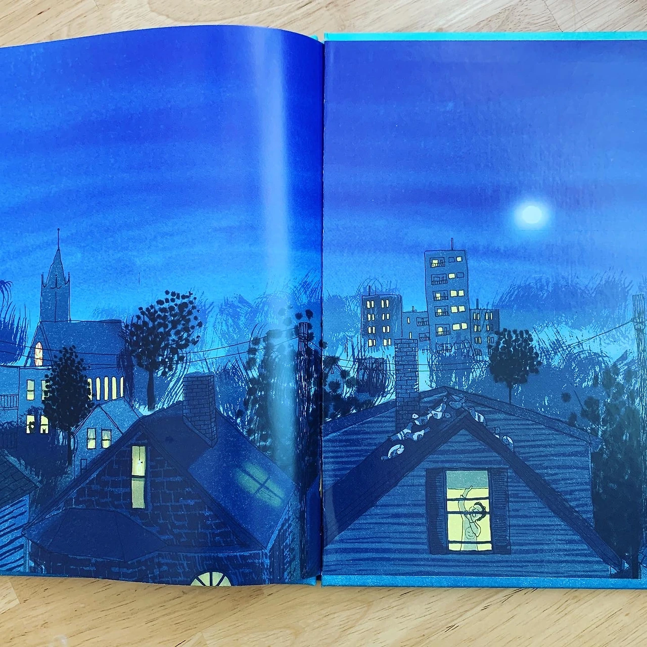 불 켜진 창문 속 이웃을 바라보는
