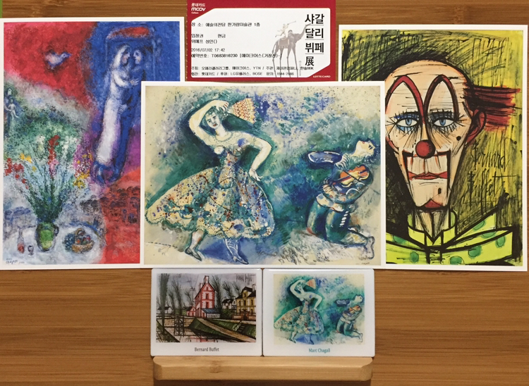 샤갈 달리 뷔페전에서는 소장하고 싶은 작품들이 정말 많았다. 하지만 아쉽게도 기념품샵에 엽서의 종류가 적었고, 화질도 좋질 않았다. 몇 종류 없는 엽서 중에서 골라온 3장. 그리고 이쁜 마그넷 2개. 사고보니 달리 작품은 없다. 달리 작품 굿즈는 맘에 드는게 없었다. 벽에 걸려있는 큰 액자들을 가지고 싶었는데, 그 액자를 걸만한 공간이 우리집에 없다..