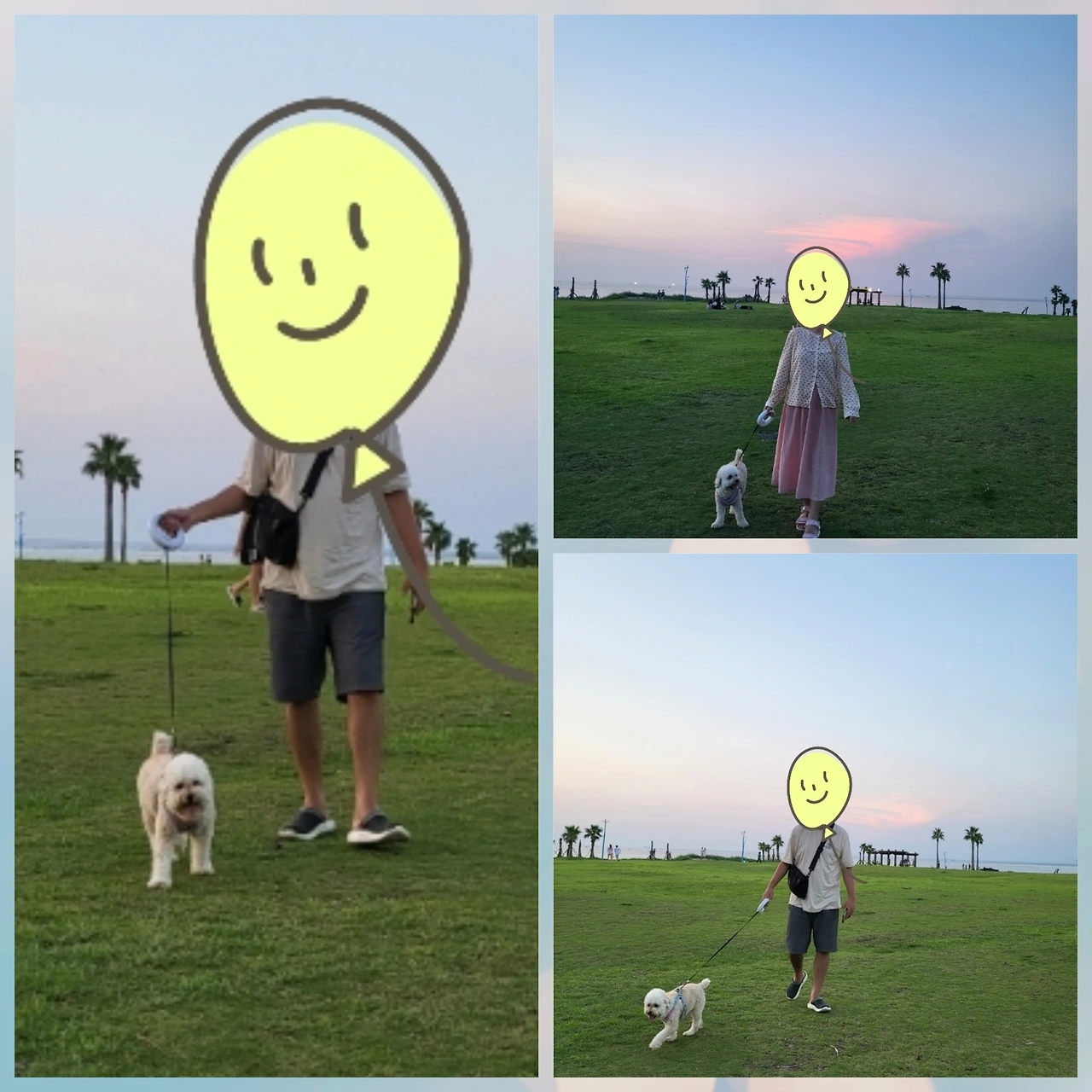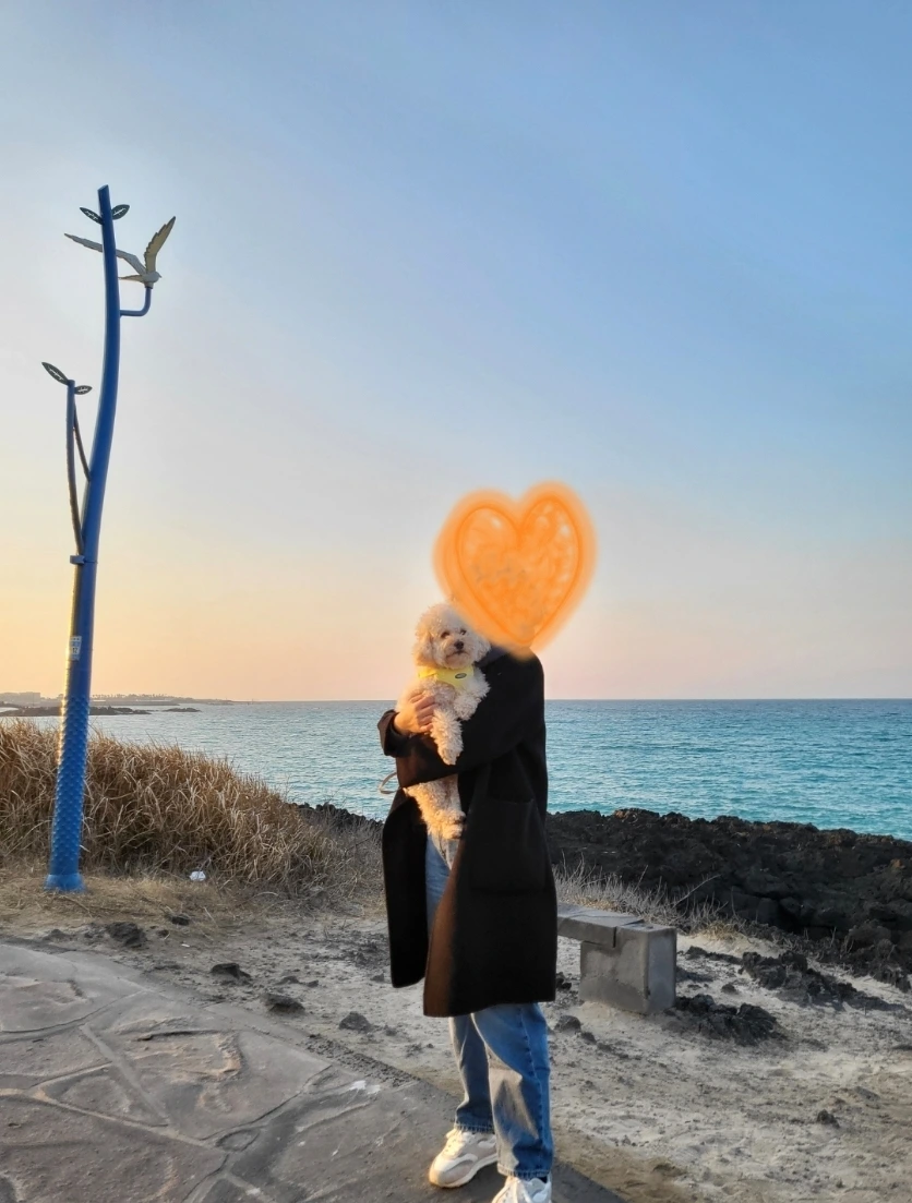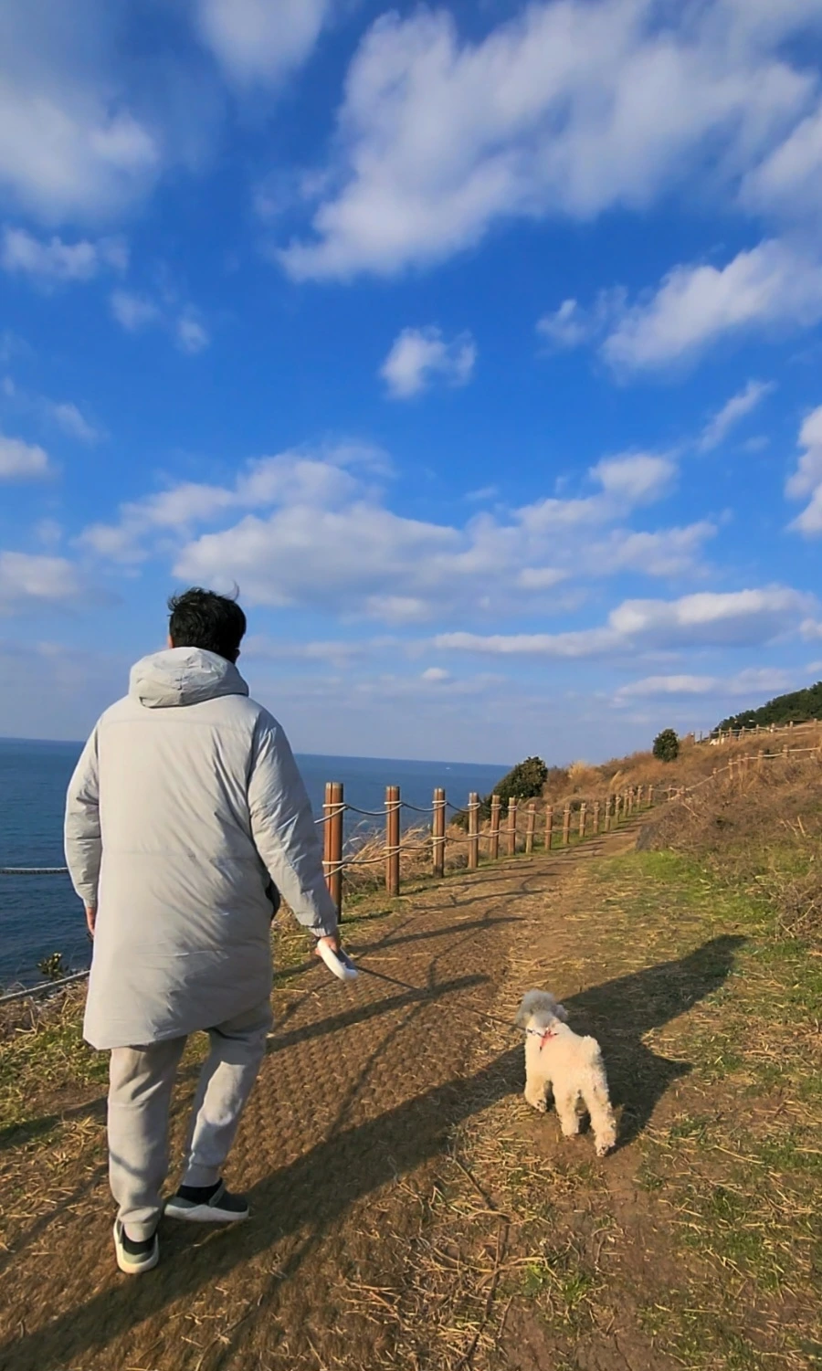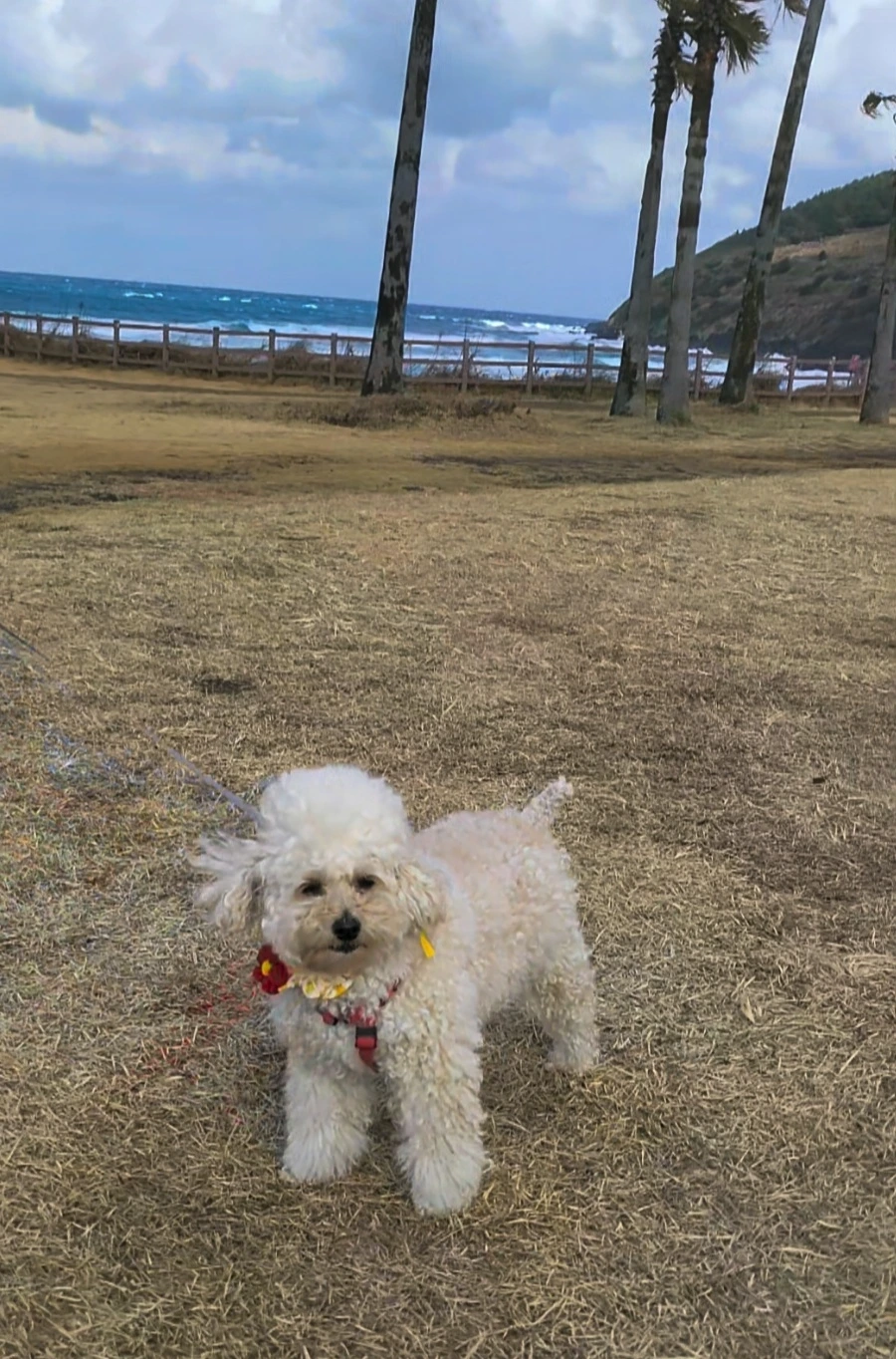아주 드물게 대형견과 만나도 자신감 있게 다가가 인사를 하는 경우도 있다. 예를 들어, 지난번 함덕해수욕장에서 만난 하얀 사모예드처럼. 함덕해수욕장의 초록빛 잔디를 걷다 구름처럼 폭실하게 생긴 하얀 사모예드와 만난 적이 있다. 당연히 하루가 무서워할 거라고 생각하고 하루의 시야를 가려주려고 하는데, 갑자기 하루가 사모예드에게 가더니 두 개가 서로 코를 맞대고 킁킁거렸다.