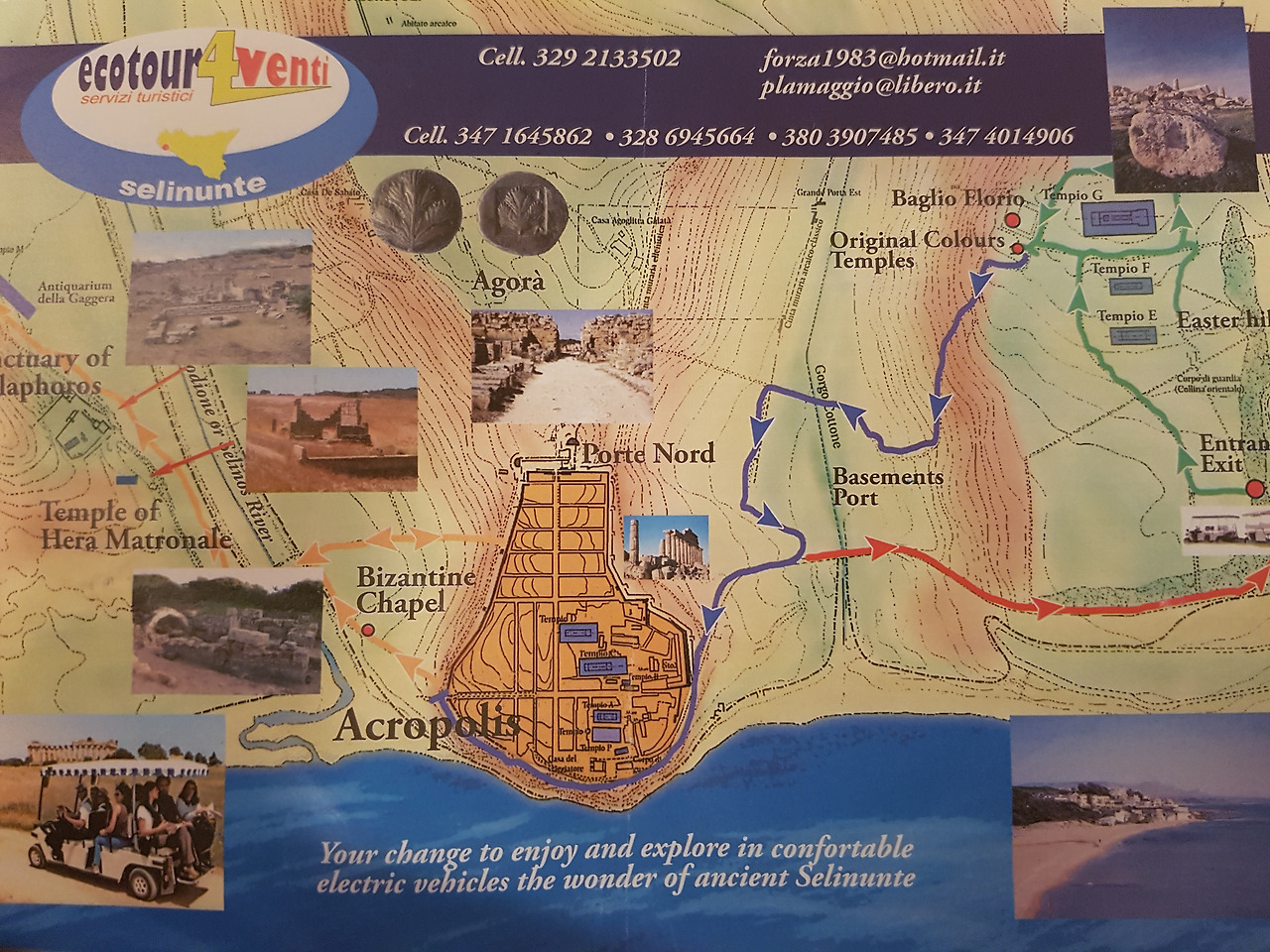 이 고고학 유적지를 관광하는 방법은 걸어서 돌아볼 수도 있지만, 3Km 이상 되는 방대한 지역을 걸어 다녀야 하여 카트가 3곳(신전과 아크로폴리스 등)을 시간 단위로 이동시켜주는 상품이 있다. 가이드가 따로 있는 것은 아니고, 카트만 태워 이동시켜주는 방식이다. 하지만, 개인적으로 가이드를 구해 설명을 듣는 이탈리아 관광객들도 있었다. 상세한 고대사에 대한 설명을 듣는 그들이 부러울 따름이었다.