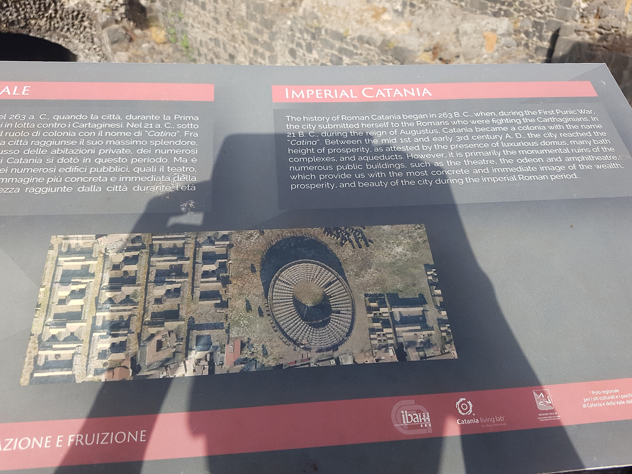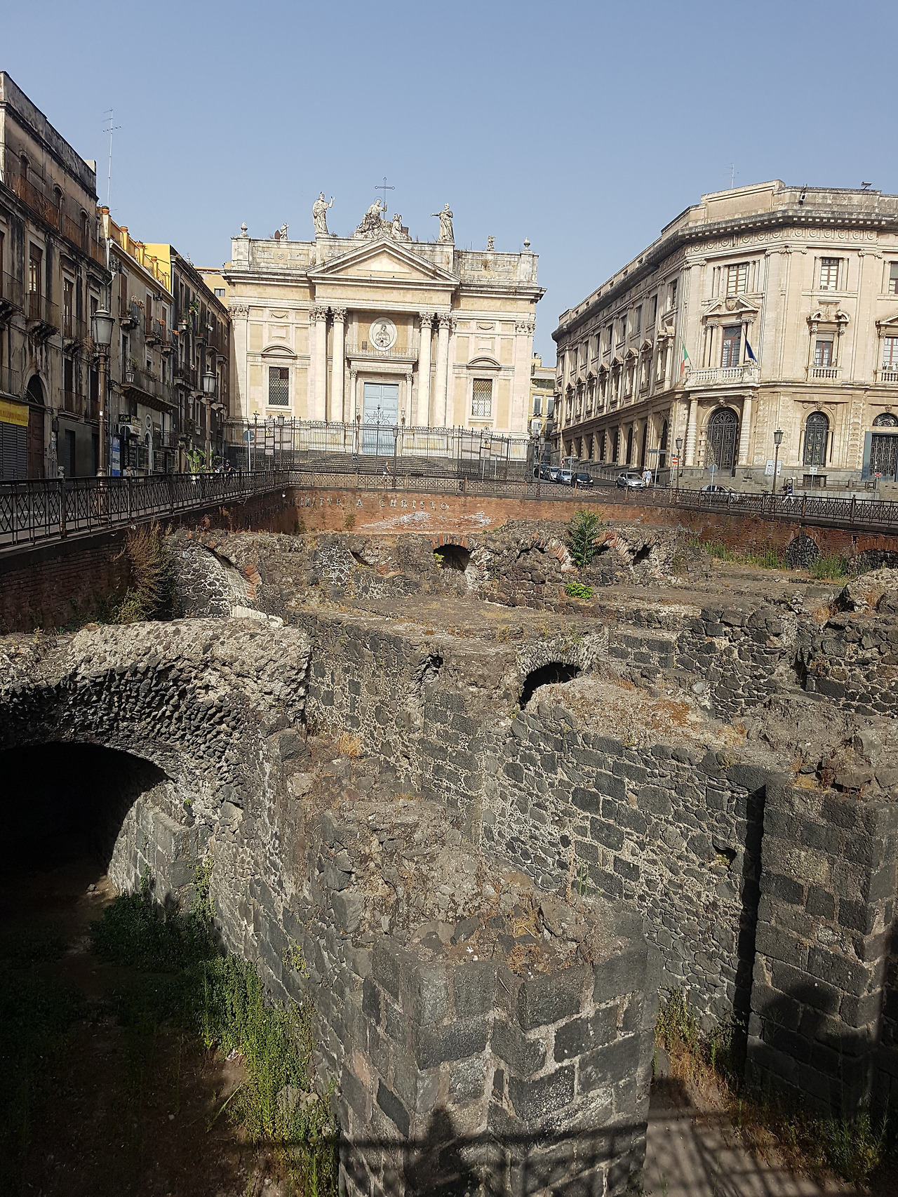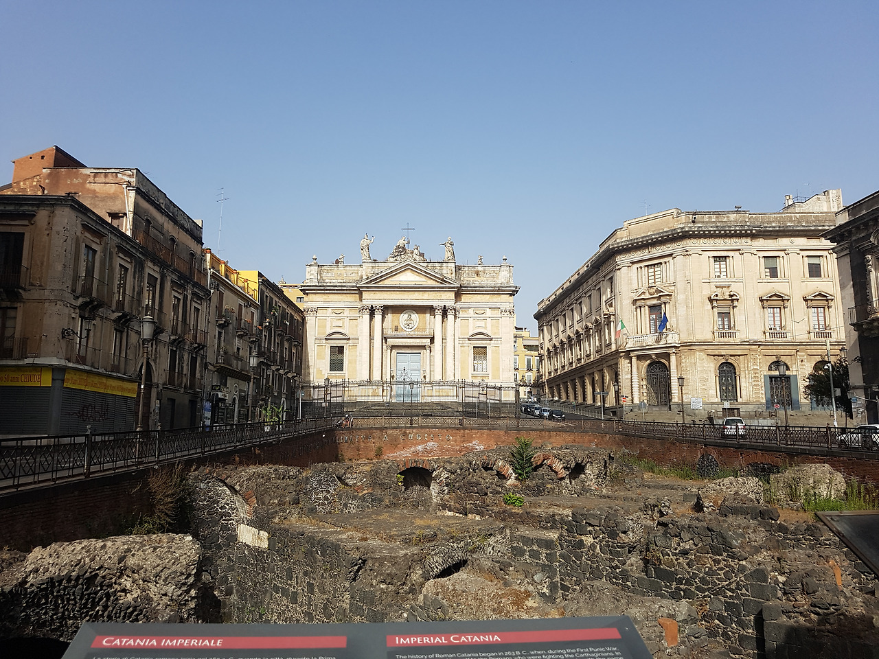 인상적인 모양으로 카타니아에 1~3세기에 지어졌던 로마인의 2개 극장은, 대극장과 리허설 극장인 Odeon이란 소극장으로 지어졌다고 한다. 카타니아는 로마시대보다 스페인의 정복 시절 발전과 변화를 하게 되는 도시로 고대의 흔적이 다른 곳 보다 많이 남아 있지 않다.