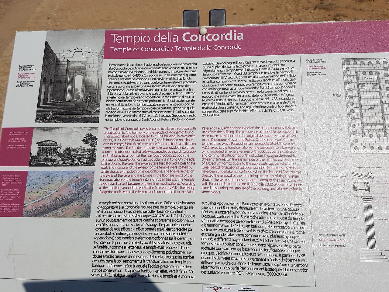 콘코르디아 신전은 가로 13개, 세로 6개의 도리아식 기둥으로 구성되어 있으며 각 기둥에 20개의 홈이 파여있다. 기원전 430년에 최초로 세워졌으며, 1748년 원래 형태로 복원하고 현재의 이름을 갖게 되었다고 한다.