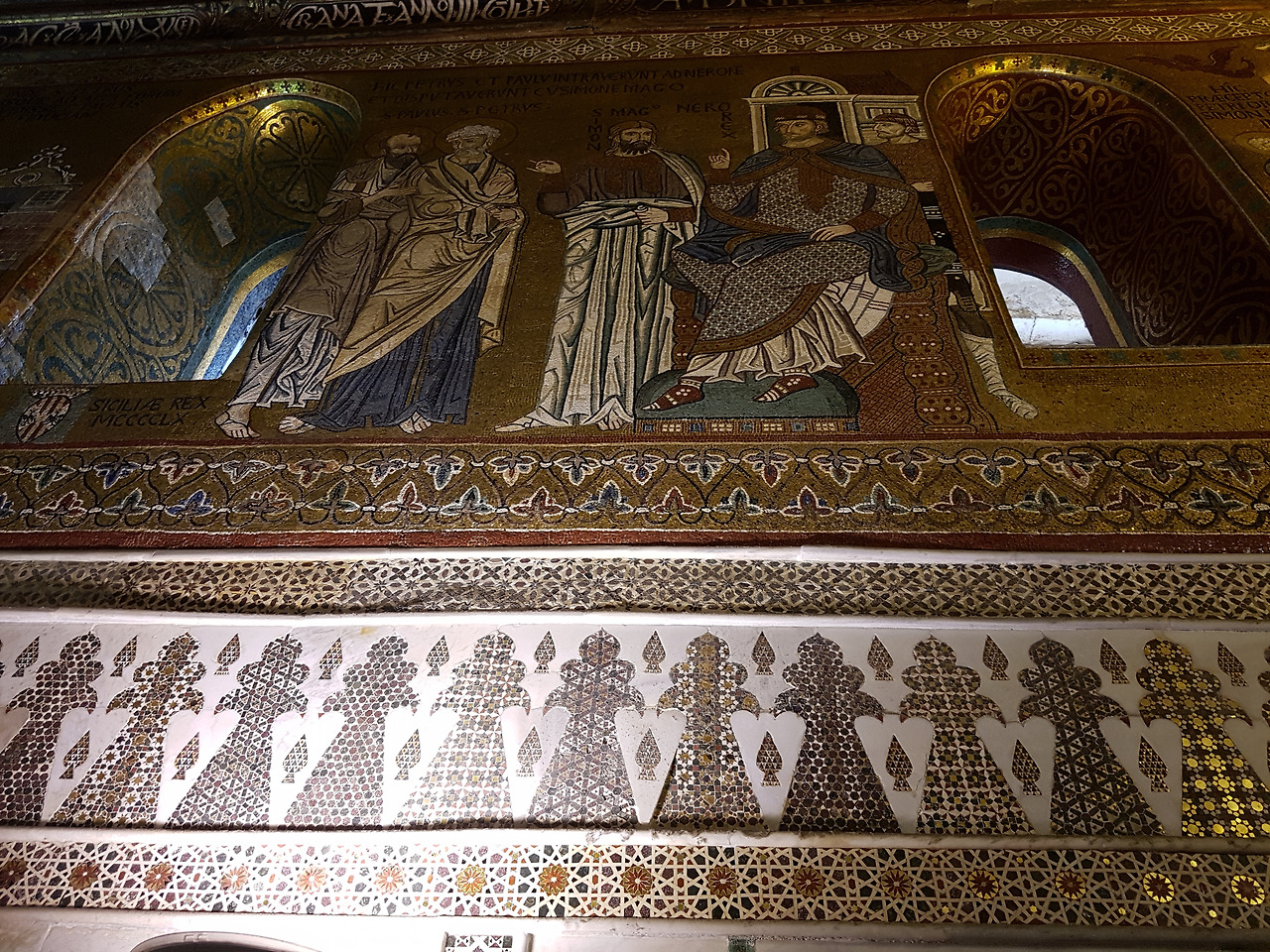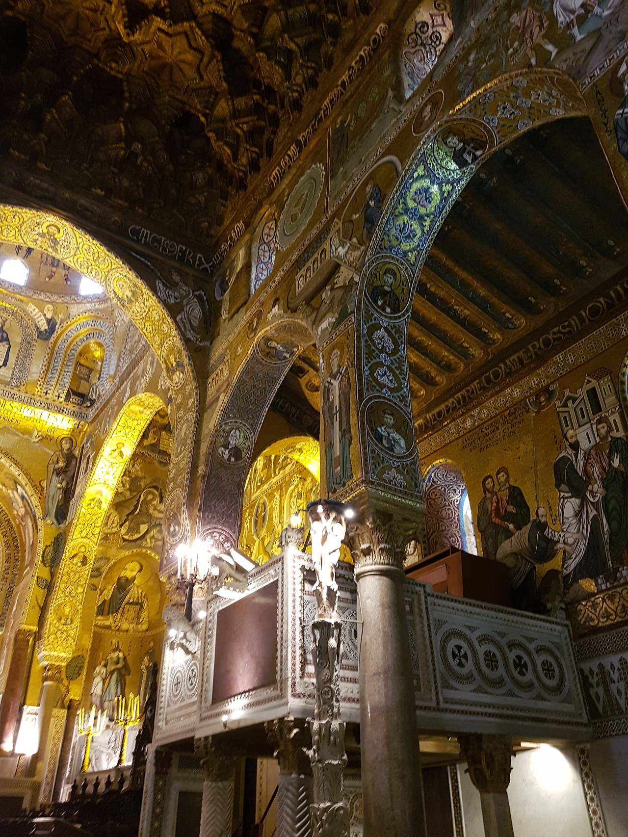 체플 내부 빼곡히 비잔틴 양식의 모자이크로 장식된 천정과 벽면은 누구나 탄성을 자아내게 만들었다. 이 훌륭한 모자이크는 로저 2세가 1140년에 그리스에서 비잔틴 모자이크 화가들을 특별히 데려와 작업토록 하게 하였다고 한다. 그리고 나무로 된 천장도 놓쳐서는 안 되는 부분이다. 기독교 교회 안에 이러한 아랍 양식의 장식을 한 곳은 유일하다고 한다. 이러한 특이성으로 인해 로저 2세가 사실은(드러내지는 않았으나) 무슬림의 종교적 정체성을 가지고 있었을 것이라고 추정하고 있다.