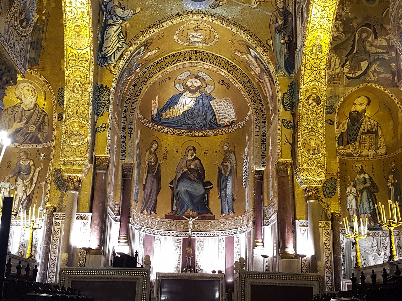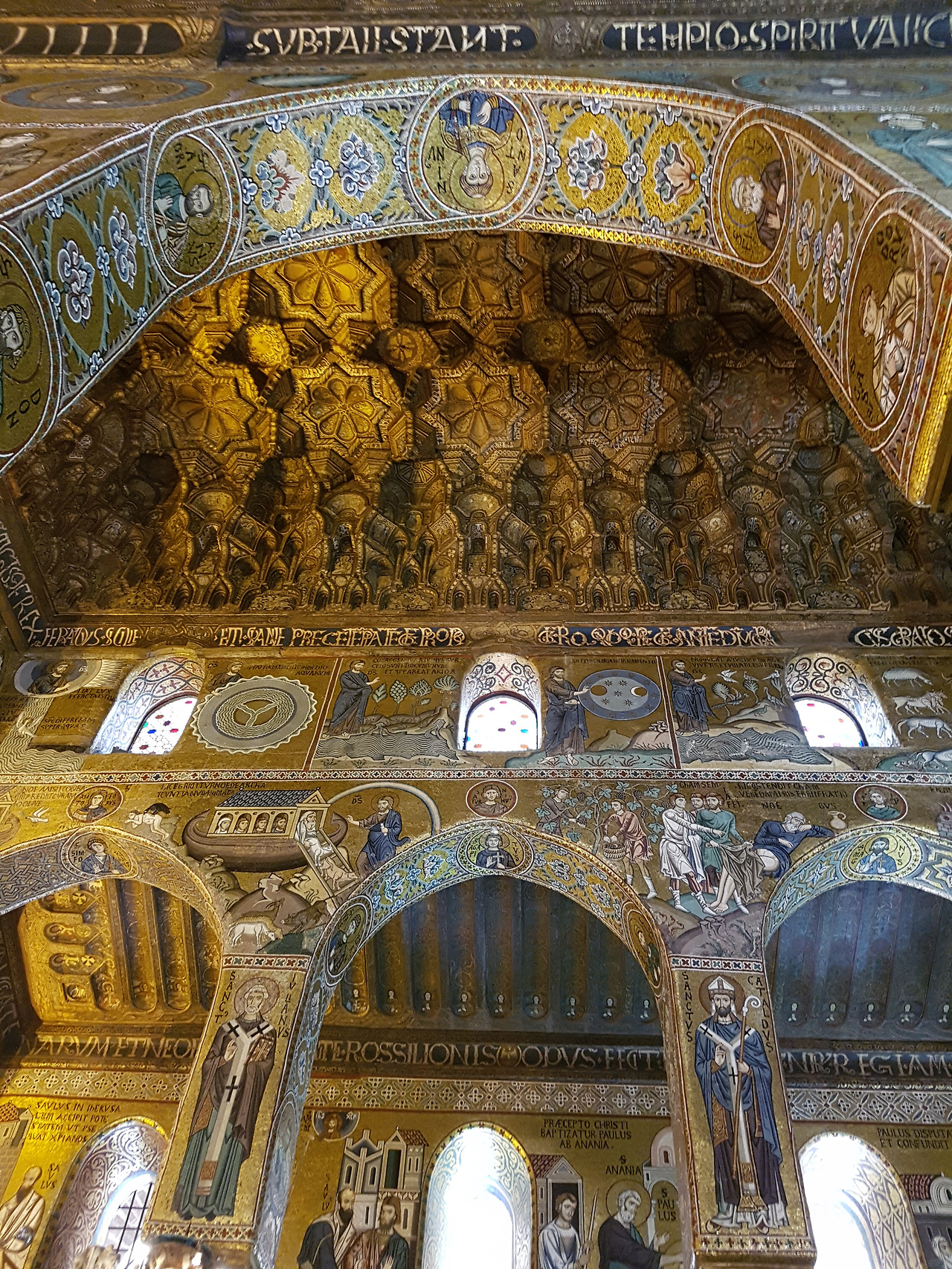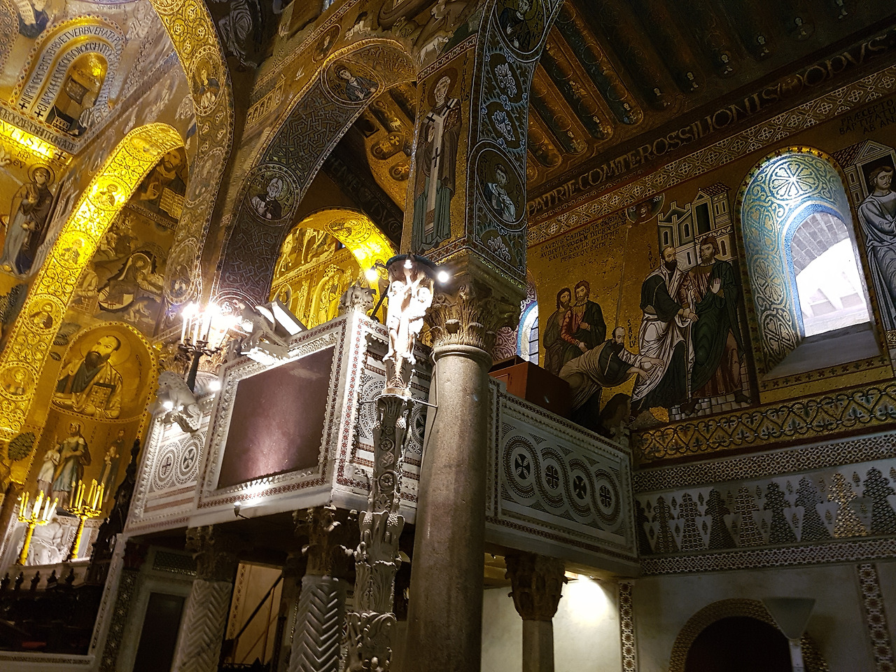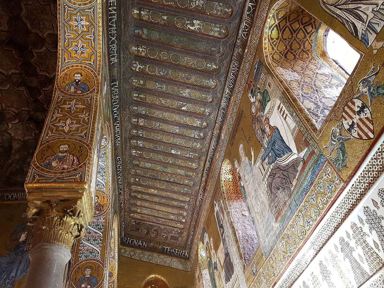당시 이 정교한 모자이크를 만들기 위해 시칠리아와 베네치아의 유능한 장인들을 총동원하였다고 한다. 10년간의 작업으로 1184년에 완공한다. 벽과 천정에는 42개의 성경 이야기를 담고 있는데, 노아의 방주를 표현한 부분은 꼭 봐야 한다. 쌍안경을 준비해 하나하나 이야기를 세심히 살펴보는 관광객도 보였다.