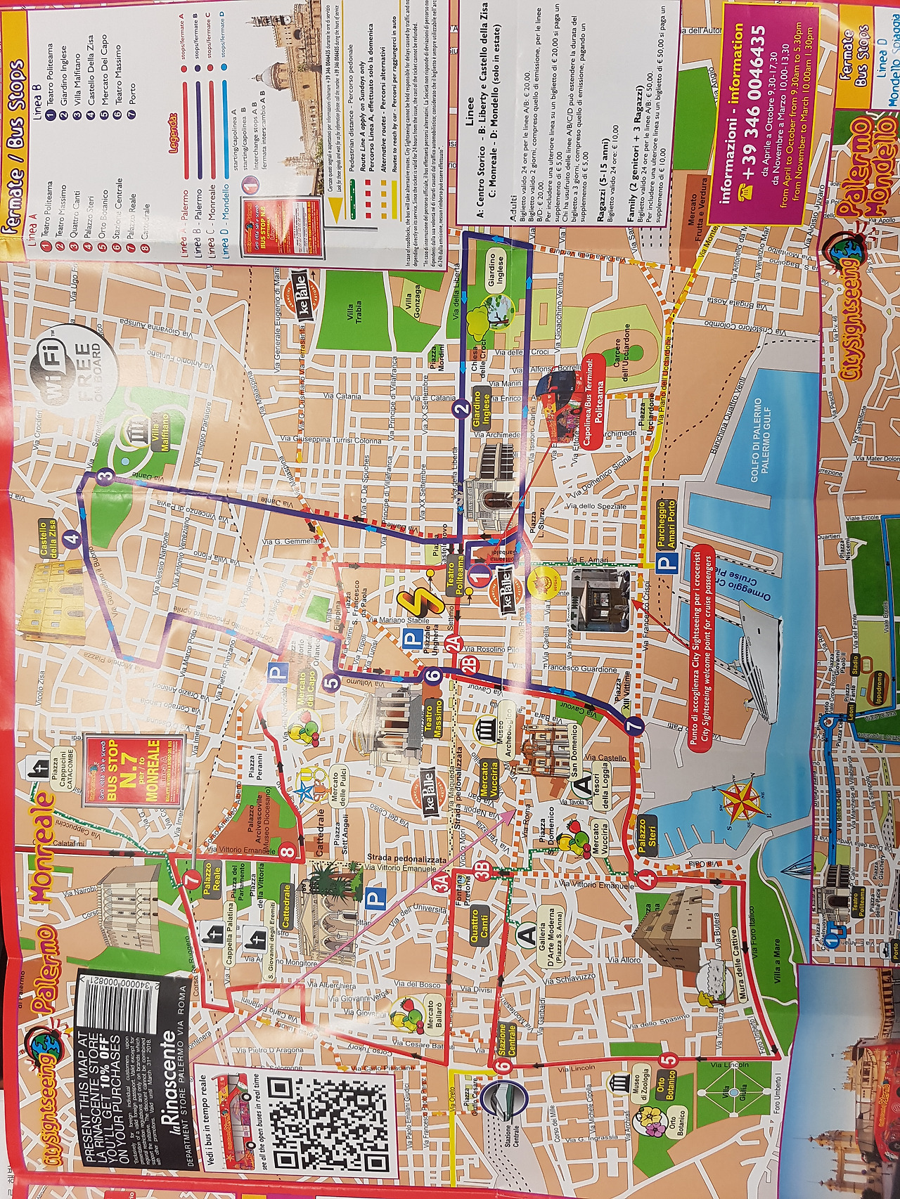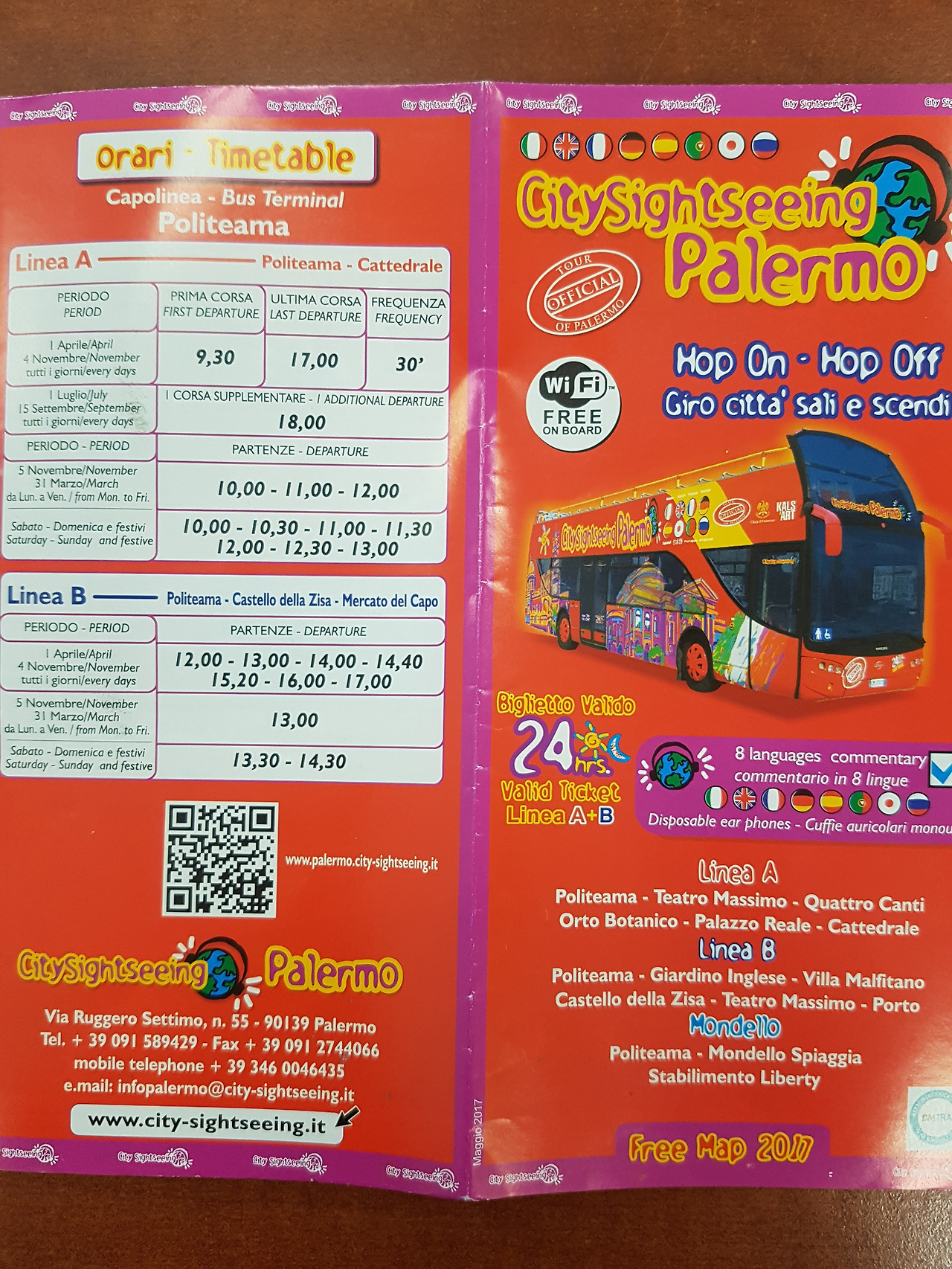 시칠리아의 주도인 팔레르모는 크기나 볼거리 면에서 시칠리아 관광의 핵심도시이다. 다른 곳보다 넓은 이 도시를 편하게 보는 방법은 원하는 곳에서 내려 버스로 이동이 가능하고, 오디오 가이드가 있는 홉 온 앤 홉 오프(Hop On Hop Off) 버스가 될 것이다. 주요 관광지를 24시간 동안 관광하는 데는 참 편리한 수단이다. 세계 유명 도시엔 어디나 있는 상품이기도 하다. 우리 가족여행에선 늘 이용하는 여행 방법이다.