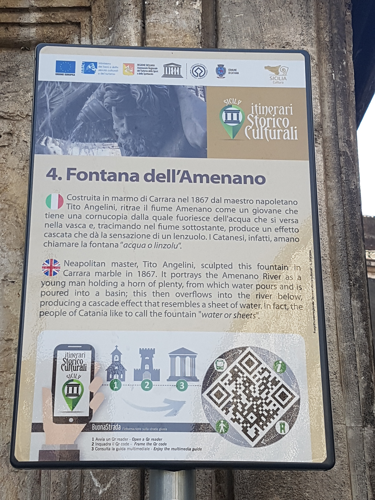 광장에서 공원과 어시장이 있는 아래쪽으로 가다 보면 19세기에 만든 Amenado분수를 만날 수 있다. 나폴리 조각가 Tito Angelini가 만든 이 분수는 아메나도강의 물을 이용한다는데, 이 강은 고대 그리스 도시를 만들었을 때는 대지를 흐르는 강이었다는데, 현재의 모습은 분수 아래 작은 개울과 같은 모습이다.