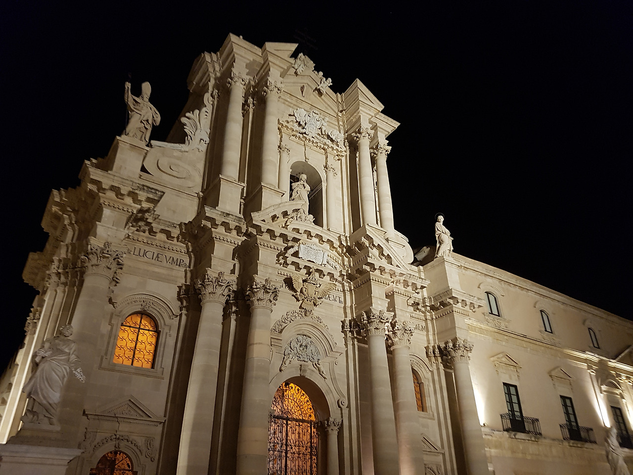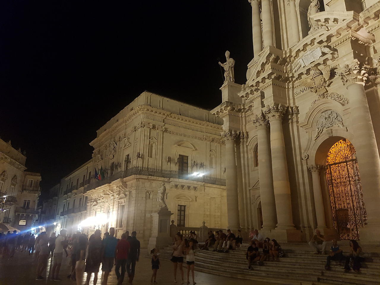 이 광장에서 가장 화려한 바로크 건물인 두오모는 기원전 5세기엔 아테네 여신을 모신 신전이었다고 한다. 성 요한 바울이 복음 전파를 위해 시라쿠스에 머물렀는데, 이로 인해 성당으로 역할을 전환하게 된다. 1693년 대지진 이후 건축한 바로크식 파사드는 Andrea Palma에 의해 1728-53년에 덧붙여진 아름다운 건축물이다.