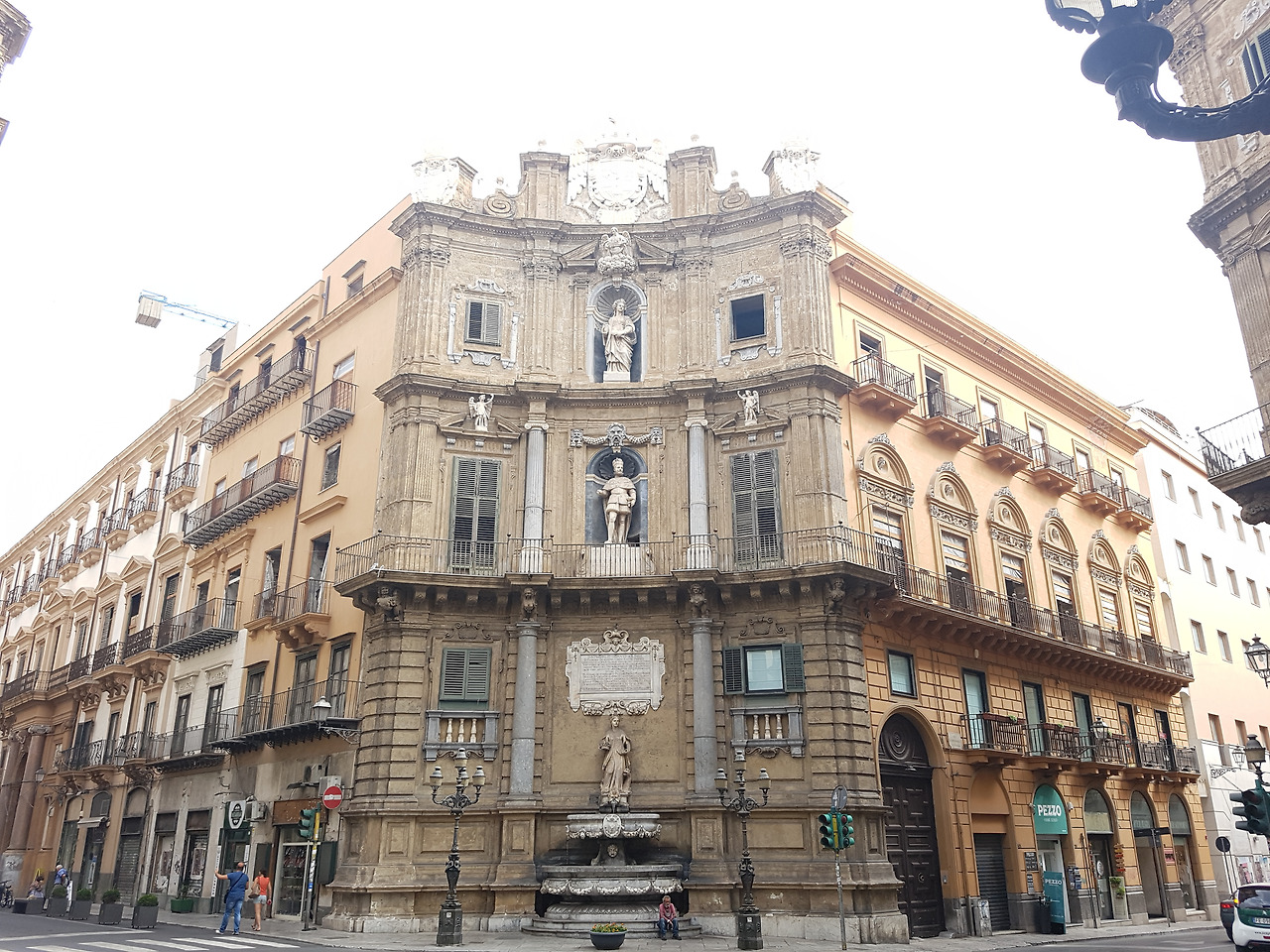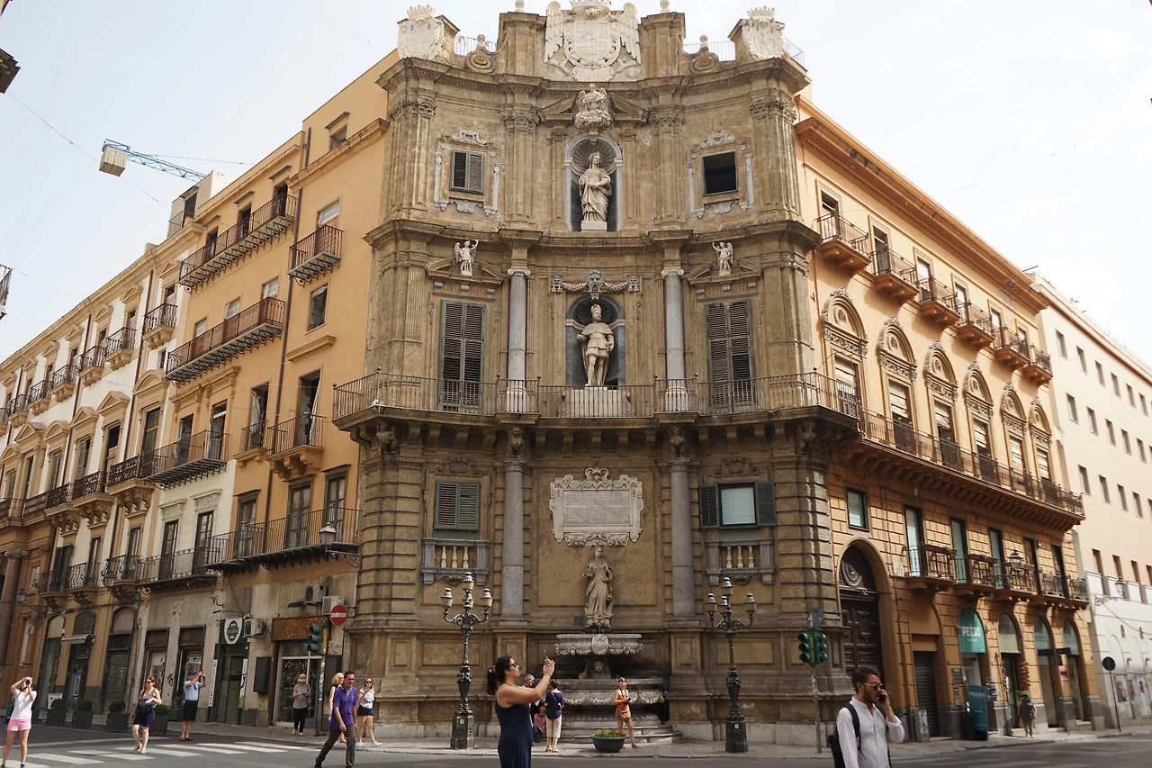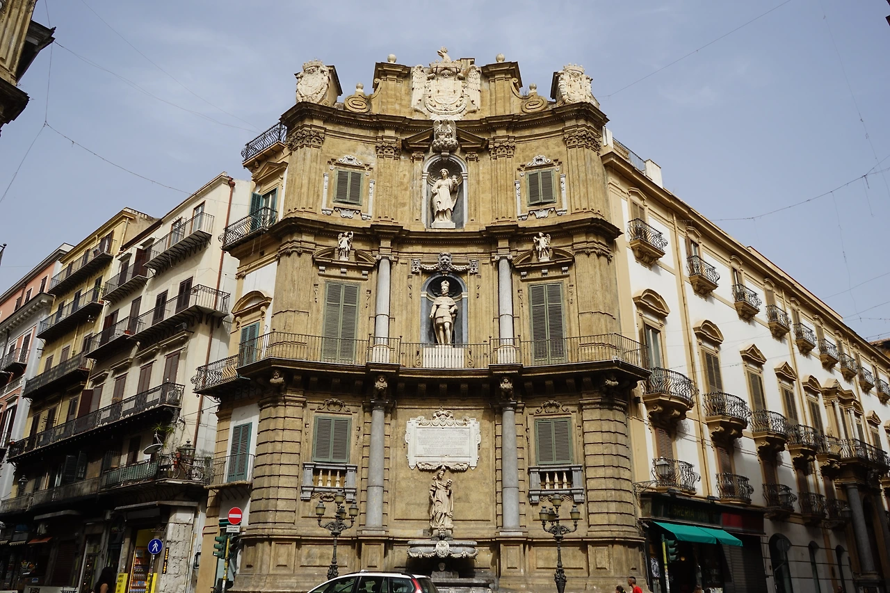 팔레르모 구시가의 중심엔 Quattro Canti(4개의 코너란 뜻)가 있다. 정확히 4방향에 원을 중심으로 동일 구조의 4개 건물이 위치하고 있다. 네 방향이다 보니 하루 종일 태양이 위치를 바꿔가며 비춘다. 그래서 '태양의 극장'이란 별칭이 있는 곳이다.