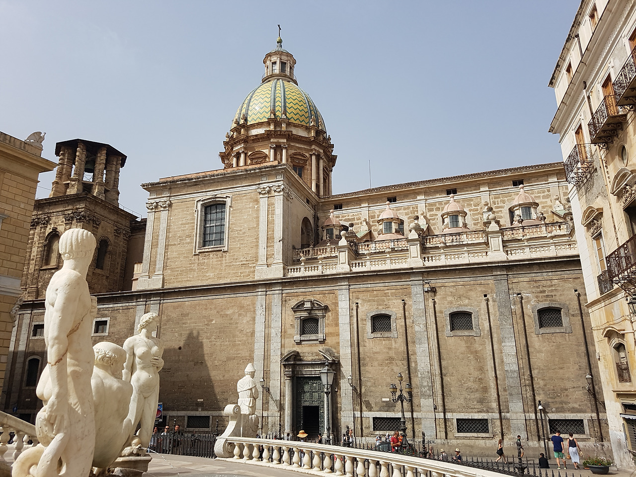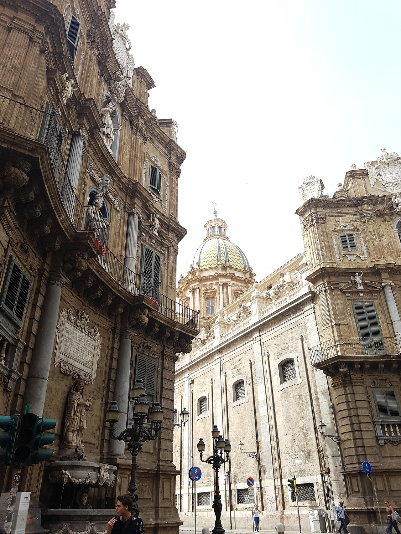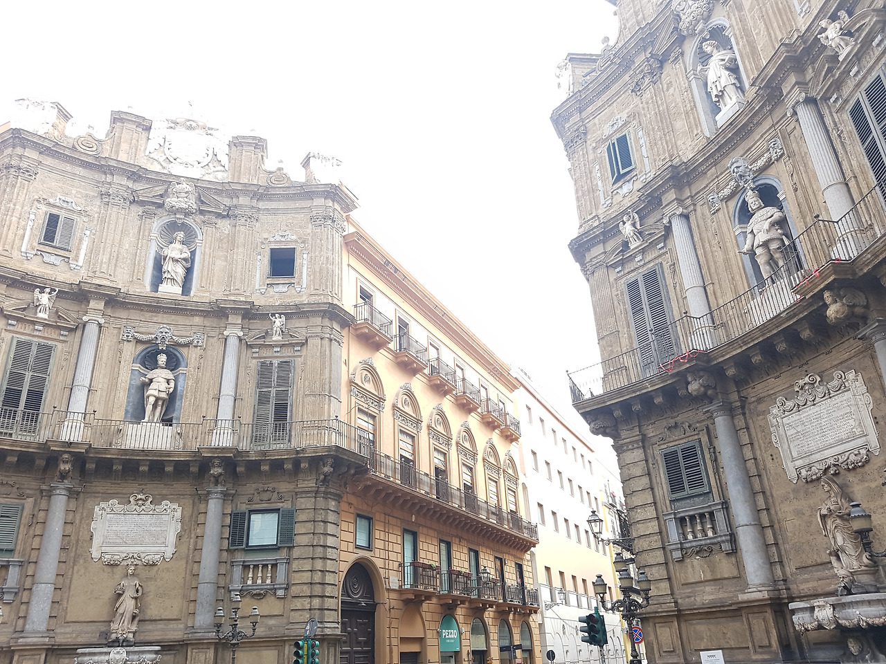 팔레르모 구시가의 중심엔 Quattro Canti(4개의 코너란 뜻)가 있다. 정확히 4방향에 원을 중심으로 동일 구조의 4개 건물이 위치하고 있다. 네 방향이다 보니 하루 종일 태양이 위치를 바꿔가며 비춘다. 그래서 '태양의 극장'이란 별칭이 있는 곳이다.