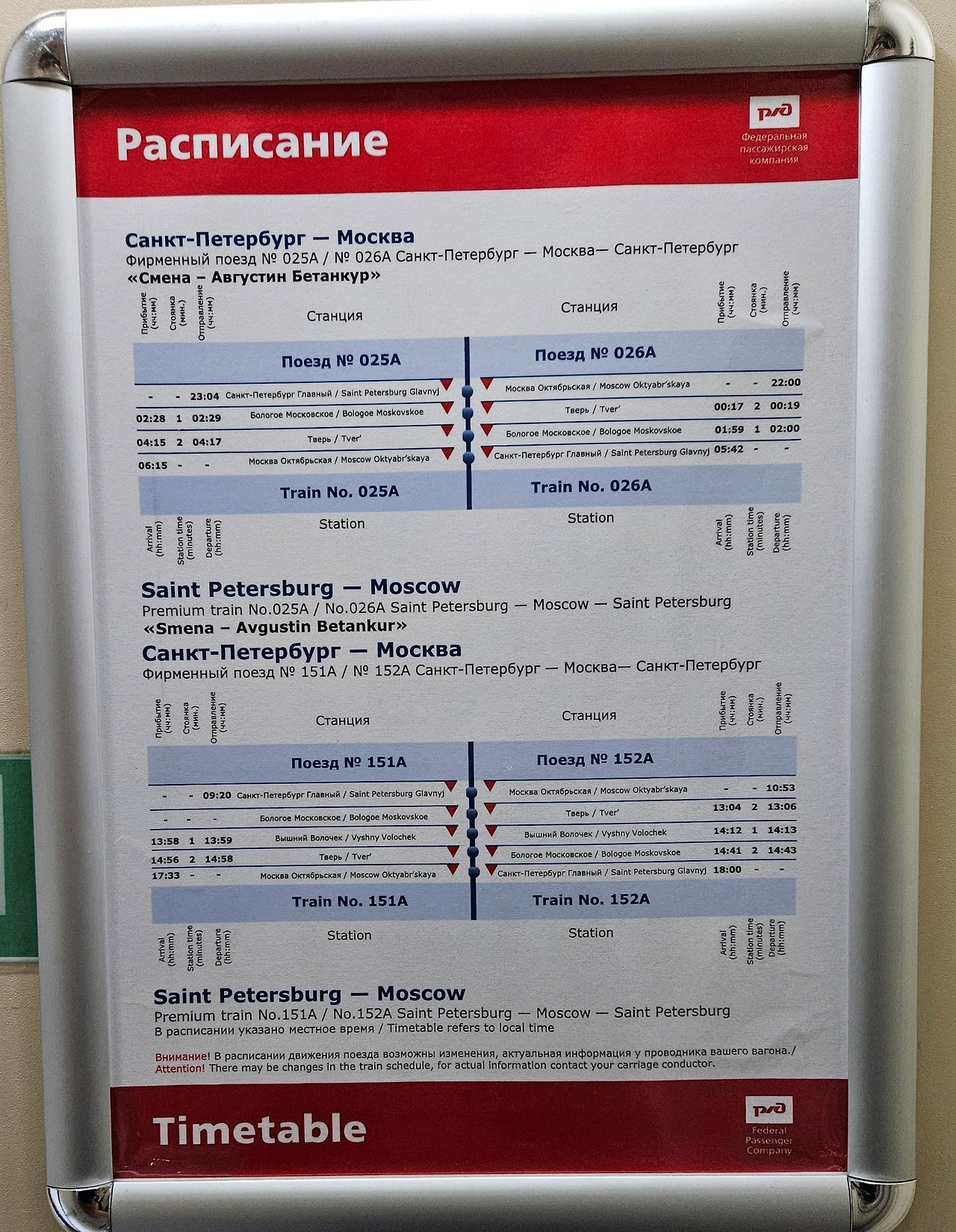 이런 장거리열차도 등급별로 속도 또는 객차의 상태가 달라지는데, 저희 가족이 탔던 026 열차는 '스메나 아 베탕쿠르' 라는 별칭이 붙은 조금 빠른 열차로 모스크바 - 페테르부르크 를 7시간 42분 만에 주파해서 체감상으로도 매우 빠르게 느껴지는 열차였습니다.