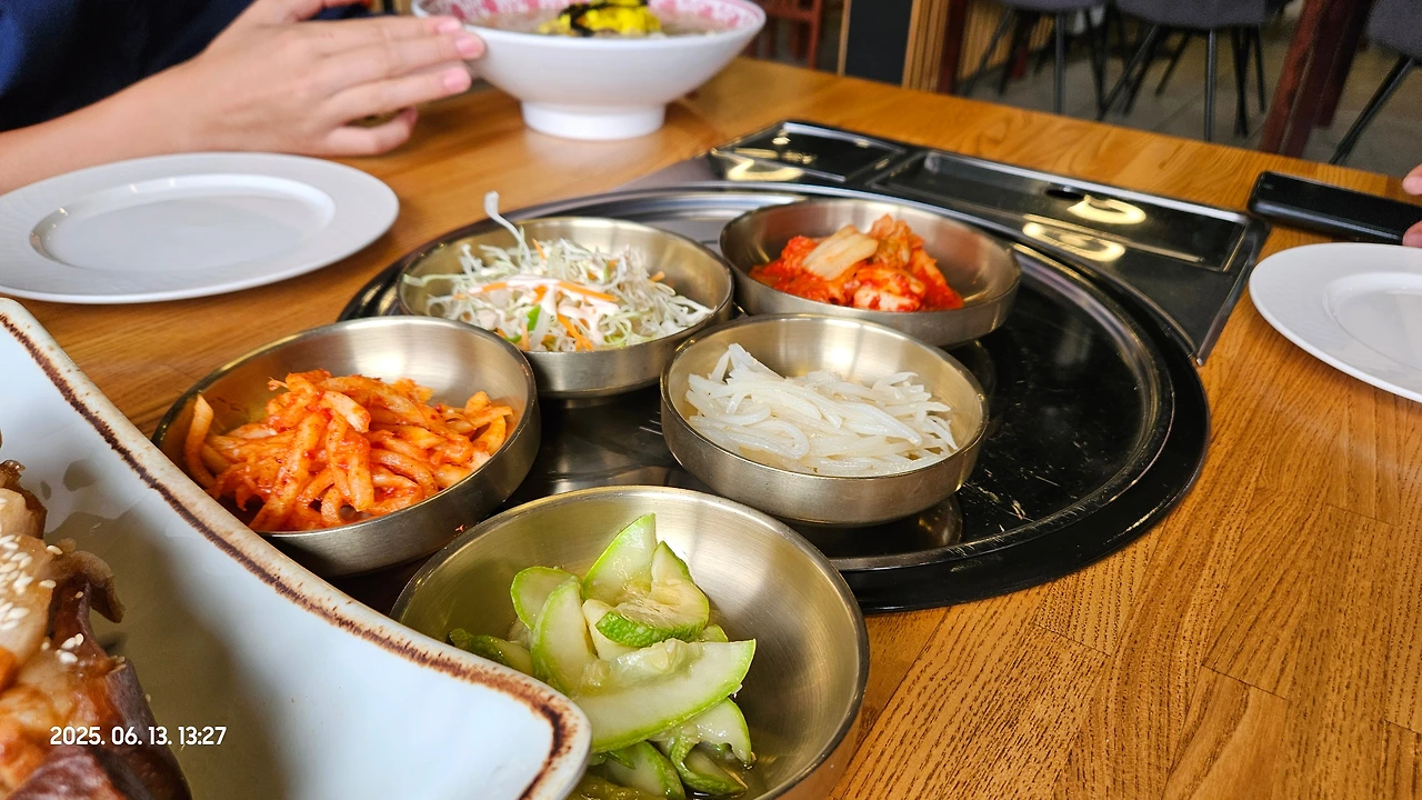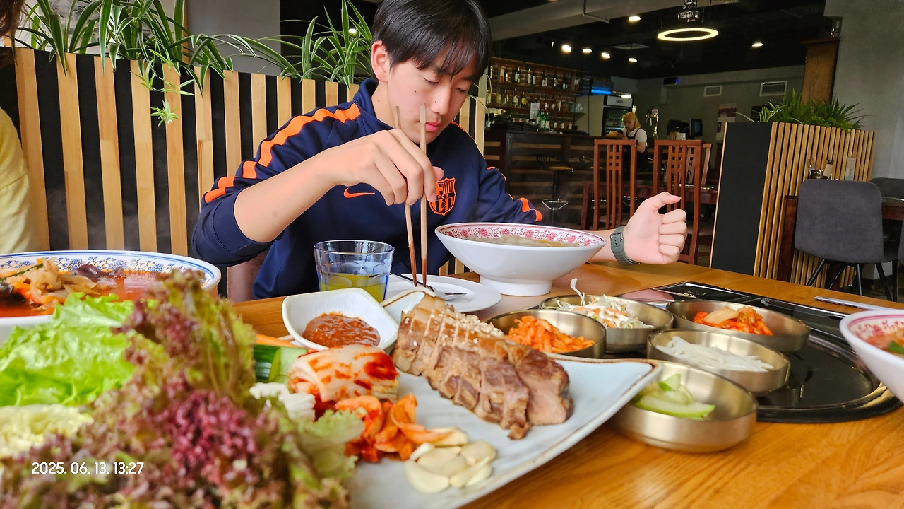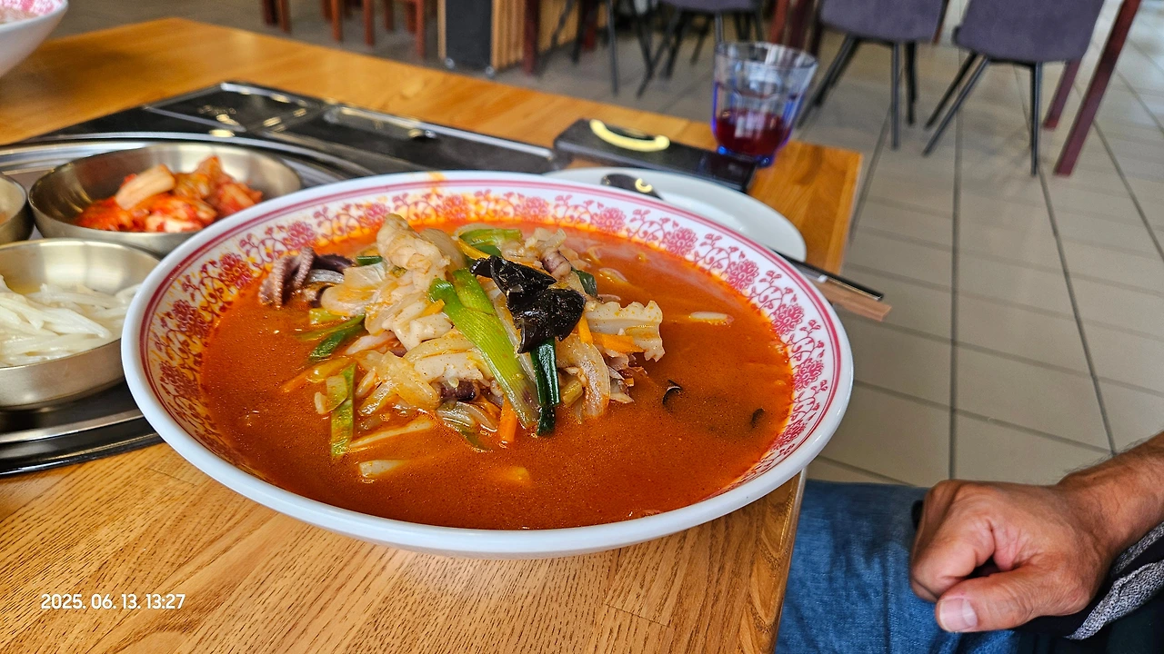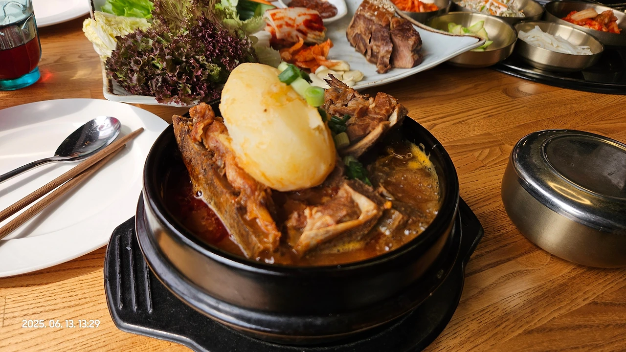민재가 아들에게 먹고싶은걸 다 시킬 수 있도록 통큰 배려를 해 주었습니다. 그래서 아들은 잔치국수 시키고, 저와 와이프는 감자탕, 친구는 여기 시그니처인 짬뽕, 그리고 친구가 아들한테 더 먹고 싶은거 없냐고 물으니 고기도 먹고 싶다고 해서 보쌈까지, 정말 푸짐한 한식 한상이 차려졌습니다.