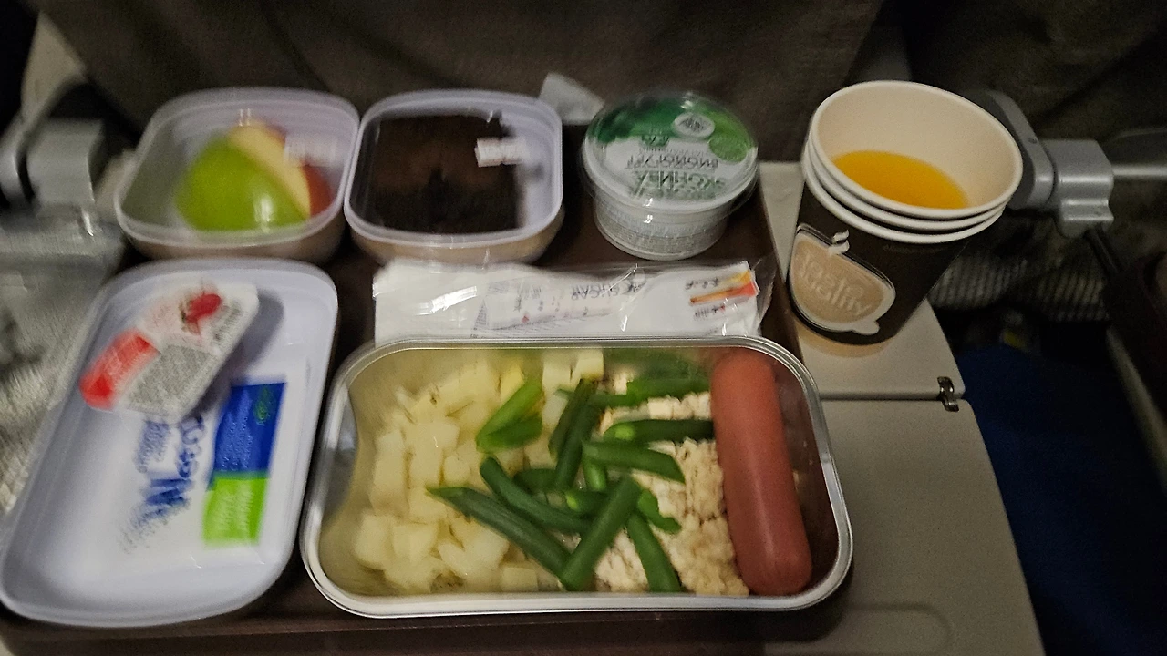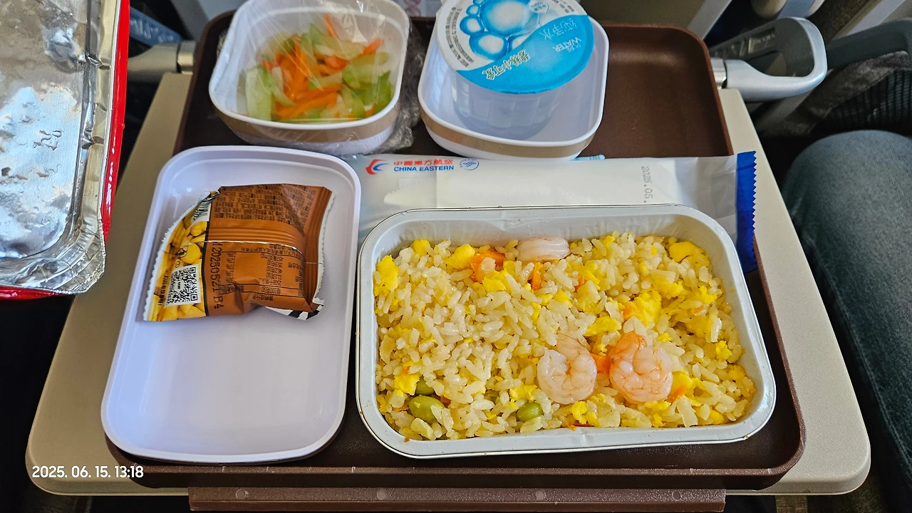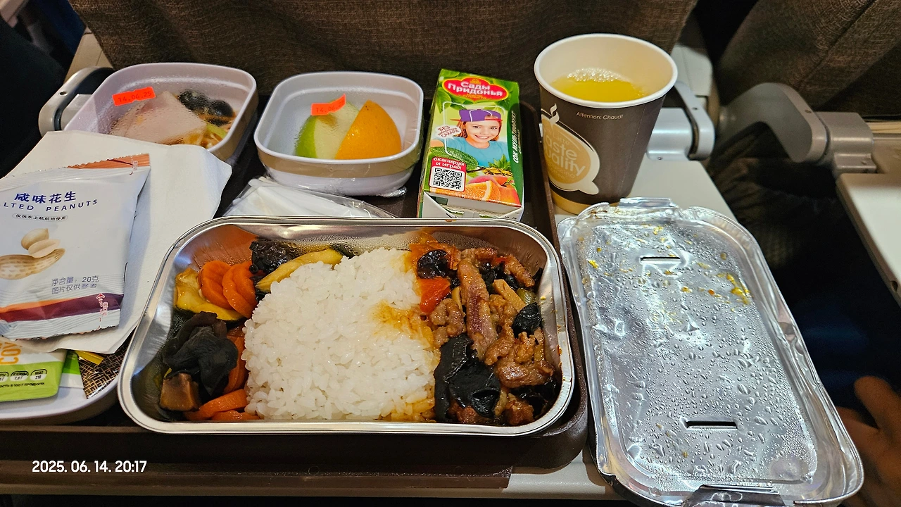 동방항공 MU592 모스크바 발 상하이 행 비행기는 약 8시간 30분 정도 비행시간 동안 두번의 식사를 줍니다. 두번 다 밥과 다른거 중에 고를 수 있었는데 모두 나쁘지 않았지만, 저는 밥종류가 더 나았습니다.