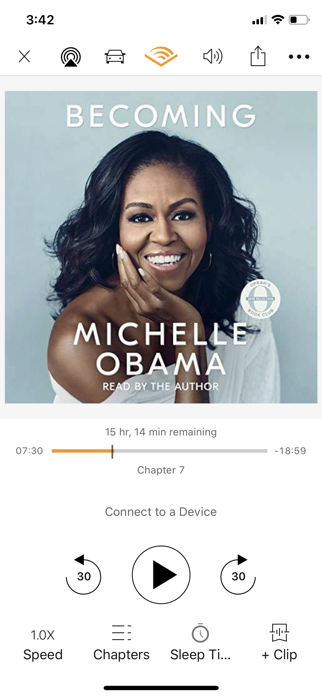 제가 가끔 듣는 미쉘 오바마의 자서전이에요. 화면 캡처 참고하세요. 속도는 왼쪽 하단에 Speed 누르시면 바꿀 수 있어요. 그리고 Sleep Timer도 있으니 자기 전에 10-20분 맞춰놓으면 저절로 꺼지고 아주 편리해요.