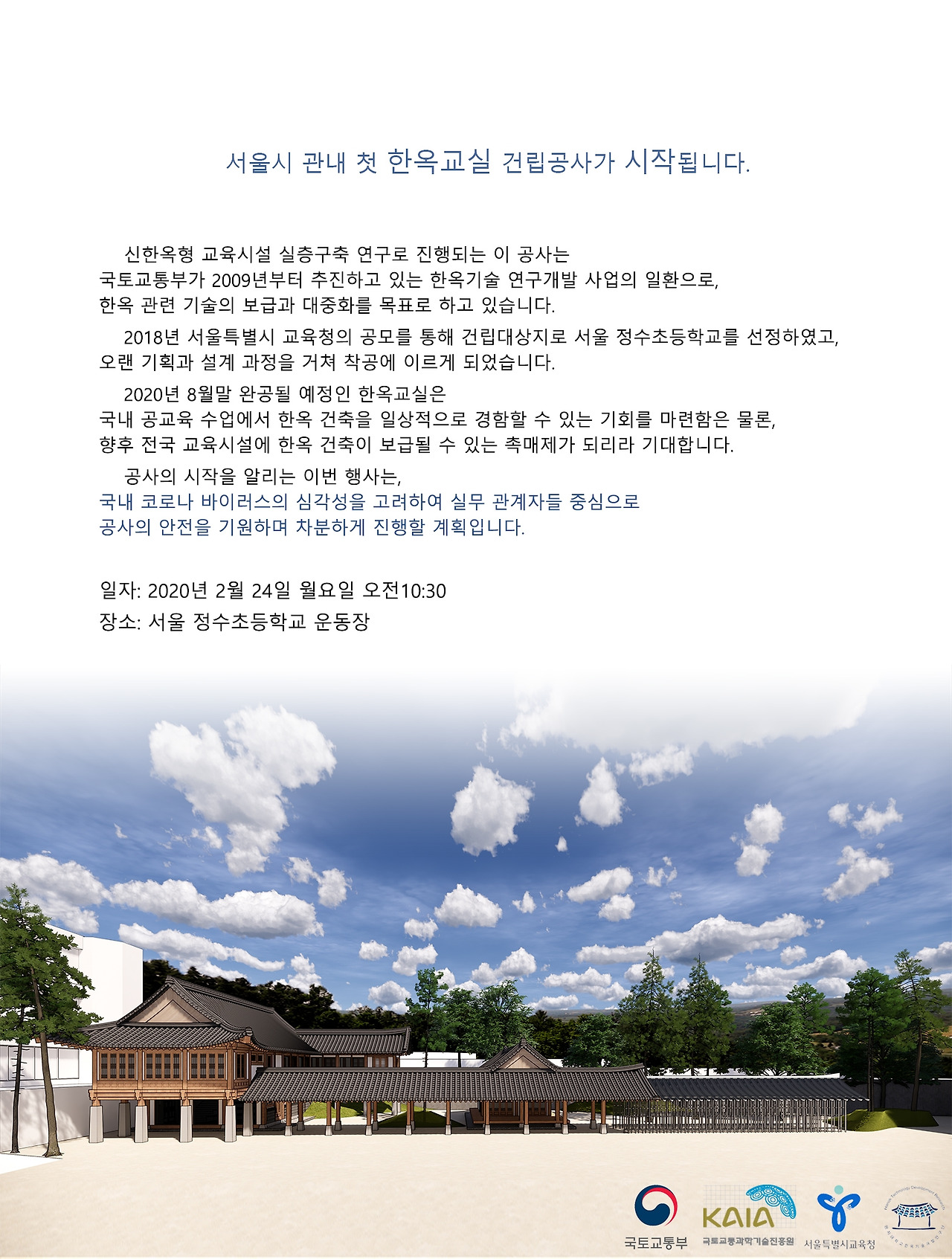 2018년 한옥시설 공모를 통해 선정된 서울정수초등학교 한옥 도서관이 오랜 논의와 설계과정을 통해 공사에 들어갔습니다. 2월 24일 착공식도 무사히 마쳤습니다.