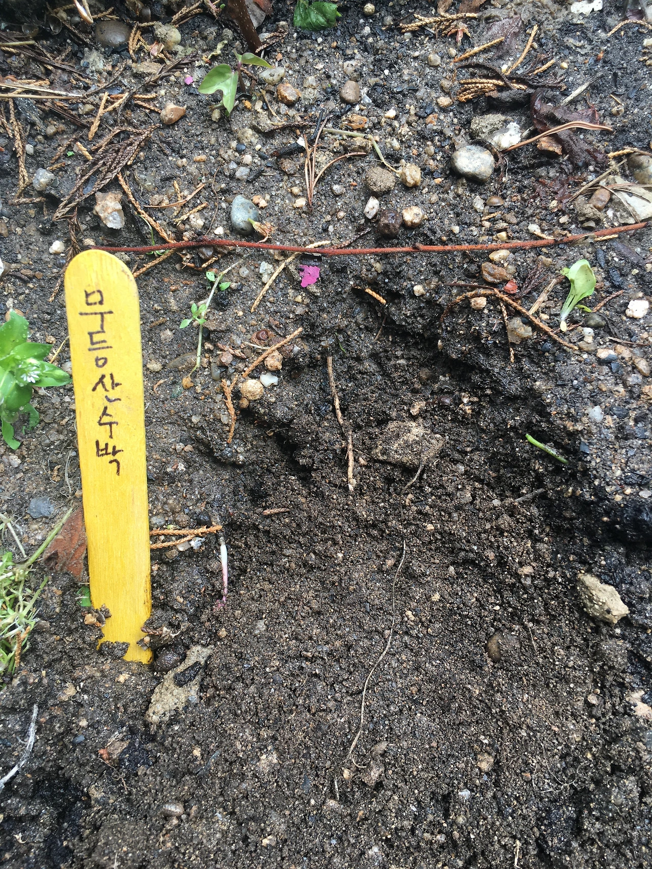 * 학교 양지 바른 땅에 무등산 수박씨를 심었습니다. (2020.4.23.)