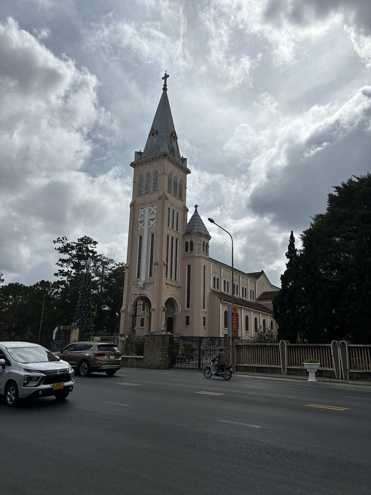 달랏 대성당은 높은 종탑과 핑크빛이 도는 붉은 외관 덕분에 멀리서도 금방 눈에 띈다. 다낭의 성당처럼 종탑 끝에 닭이 앉아 있지는 않지만, 하늘을 향해 곧게 뻗은 47m 높이의 종탑과 십자가는 그 자체로 경건한 위용을 자랑한다. 프랑스 식민지 시절의 근대 고딕 양식이 잘 보존되어 있는데, 내부의 70여 개 스테인드글라스 창을 통해 들어오는 빛을 보고 있으면 "유럽의 성당을 통째로 달랏에 옮겨놓았다"는 말이 과언이 아님을 실감하게 된다.