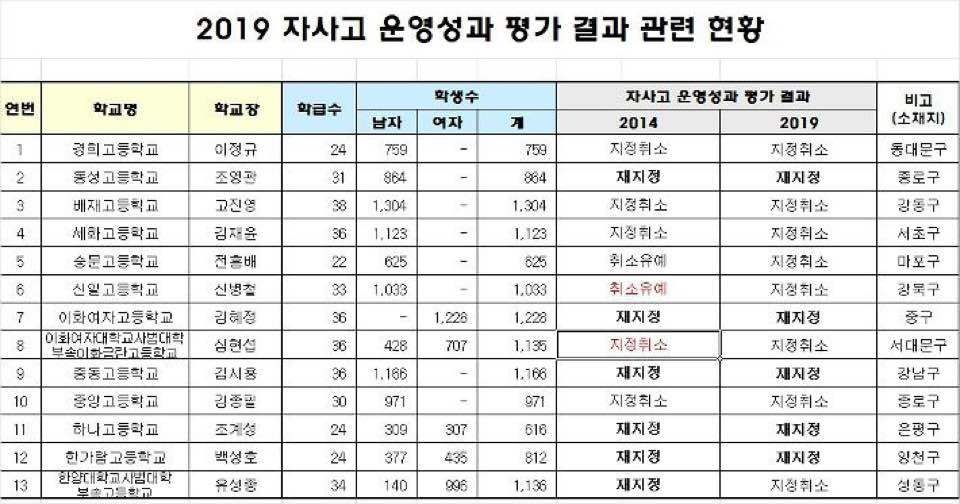 서울시 교육청은 오늘(7월 9일) 오전 자사고에 대한 재지정 평가 결과를 발표했다. 평가대상교 13개교 중 8개 학교(경희고, 배제고, 세화고, 숭문고, 신일고, 이대부고, 중앙고, 한양부고)가 재지정 취소되어 내년부터 일반고로 전환된다. 나머지 5개교(동성고, 중동고, 이화여고, 하나고, 한가람고)는 앞으로 5년간 자사고를 유지할 수 있게 되었다.