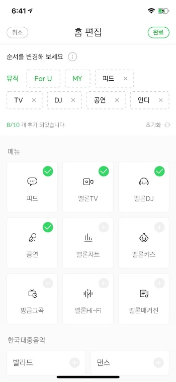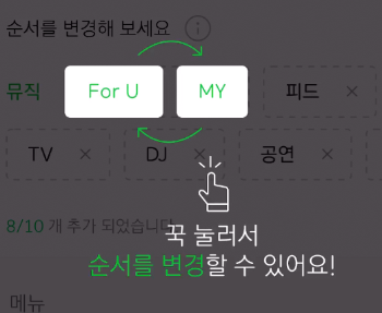 첫 번째 과제는 홈 편집 기능을 이용해 직접 홈 편집을 해보는 것이다. 홈 편집은 사용자가 직접 홈 상단의 메뉴와 순서를 편집할 수 있는 기능인데, 최근 업데이트된 멜론 5.0의 주요 기능 중 하나이다.