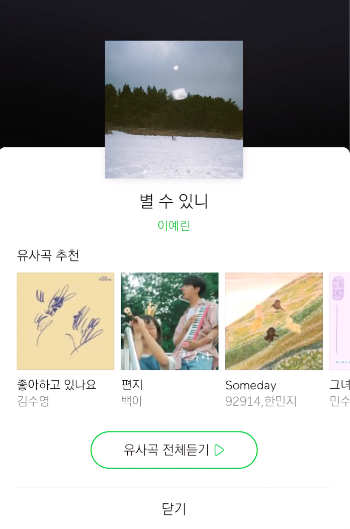 유사곡 추천 기능을 이용할 때, 팝업창에서 곡 하나를 클릭할 때마다 해당 곡의 개별화면으로 넘어가버리는 것이 참여자들에게 가장 큰 불편함이었다. 모든 유사곡을 둘러보고 싶은데 하나하나 개별화면으로 들어가서 봐야 한다는 점이 번거롭다는 반응이 많았다. 팝업창에서 원하는 노래는 바로 재생해본다던가, 몇 개를 바로 선택해서 재생목록이나 플레이리스트에 추가하고 싶다고 했다.