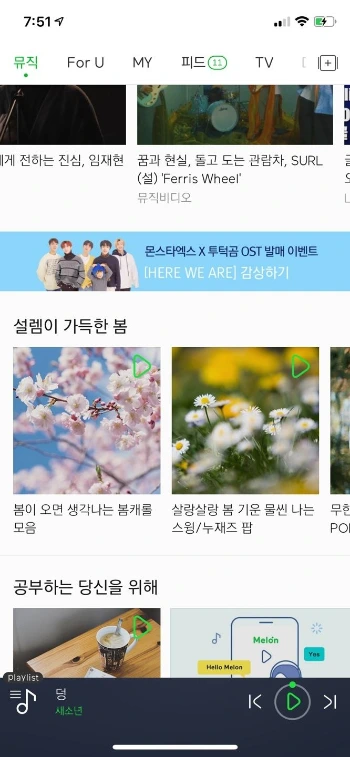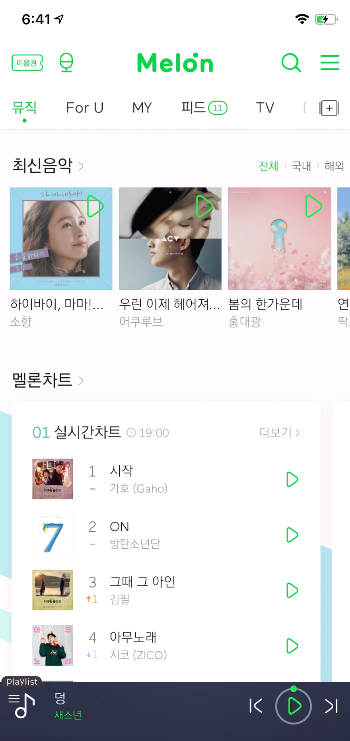 2-2) 홈에서 재생목록과 플레이리스트가 구분되어 있지 않고 하단 바 하나로 통일되어있다